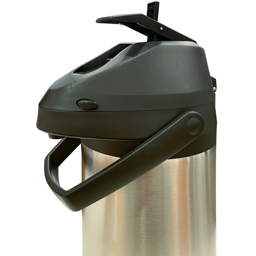 Stora pumptermosar i rostfritt stål och med svarta detaljer, för fest och buffe. Insatsen är även i rostfritt stål.