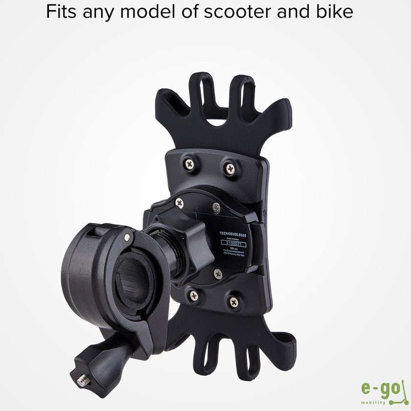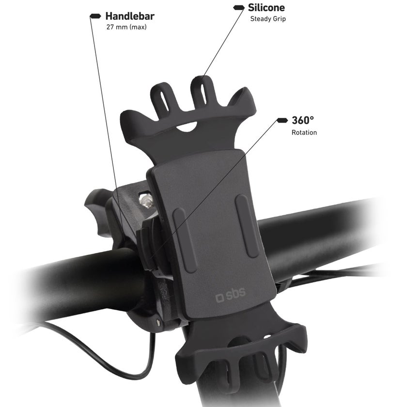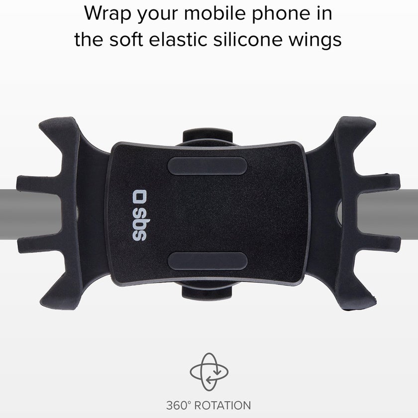Den 360° roterbara mobiltelefonhållaren är perfekt för att fästa din smartphone på styret på en cykel eller skoter. Du sätter enkelt fast klämman på styret på ditt tvåhjuliga fordon och fäst sedan stödet som sveper runt telefonen. Mjuka silikonvingar sveper runt toppen och botten, detta hindrar telefonen från att ramla av och minskar också vibrationerna från underlaget.