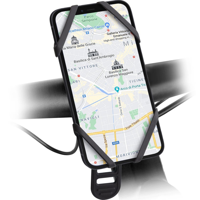 Med denna mobiltelefonhållare i silikon fäster du enkelt och säkert din smartphone på styret på din cykel, elcykel, skoter eller Segway. Fäst hörnen på din enhet med de fyra elastiska flikarna. Fäst sedan hållaren på styret på cykeln eller skotern med hjälp av den integrerade, justerbara remmen. På så sätt förblir enheten stabil och vibrationsfri under dina resor. Telefonen sitter säkert på plats utan att bli skadad.