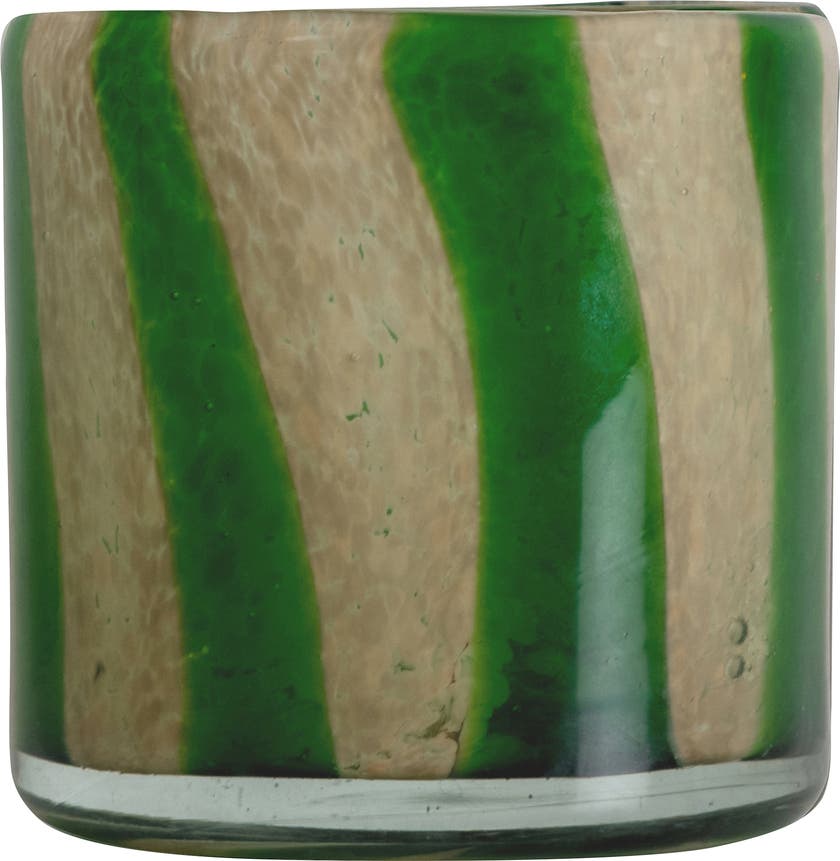Vas/Ljuslykta Curve. Handgjorda ljuslyktor i organiska former med fantastiska kurvor i grönt glas. Som dansande ränder i en förtrollad värld. Den äppelgröna färgen är både cool och lyxig tillsammans med den beige.