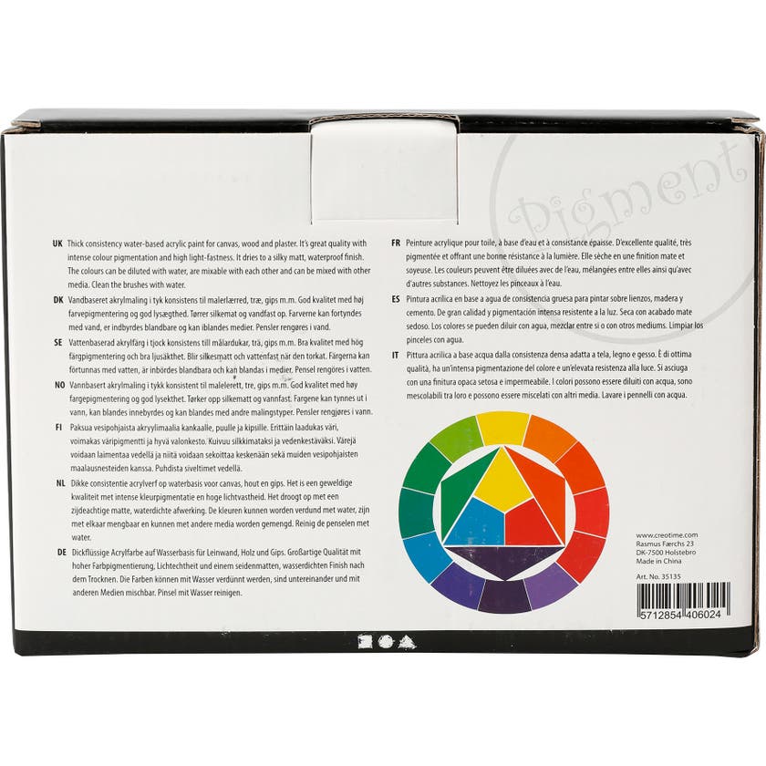 Akrylfärg Pigment 75 gram x 5. Vattenbaserad akrylfärg i tjock konsistens till målardukar, trä, gips m.m. Bra kvalitet med hög färgpigmentering och bra ljusäkthet.