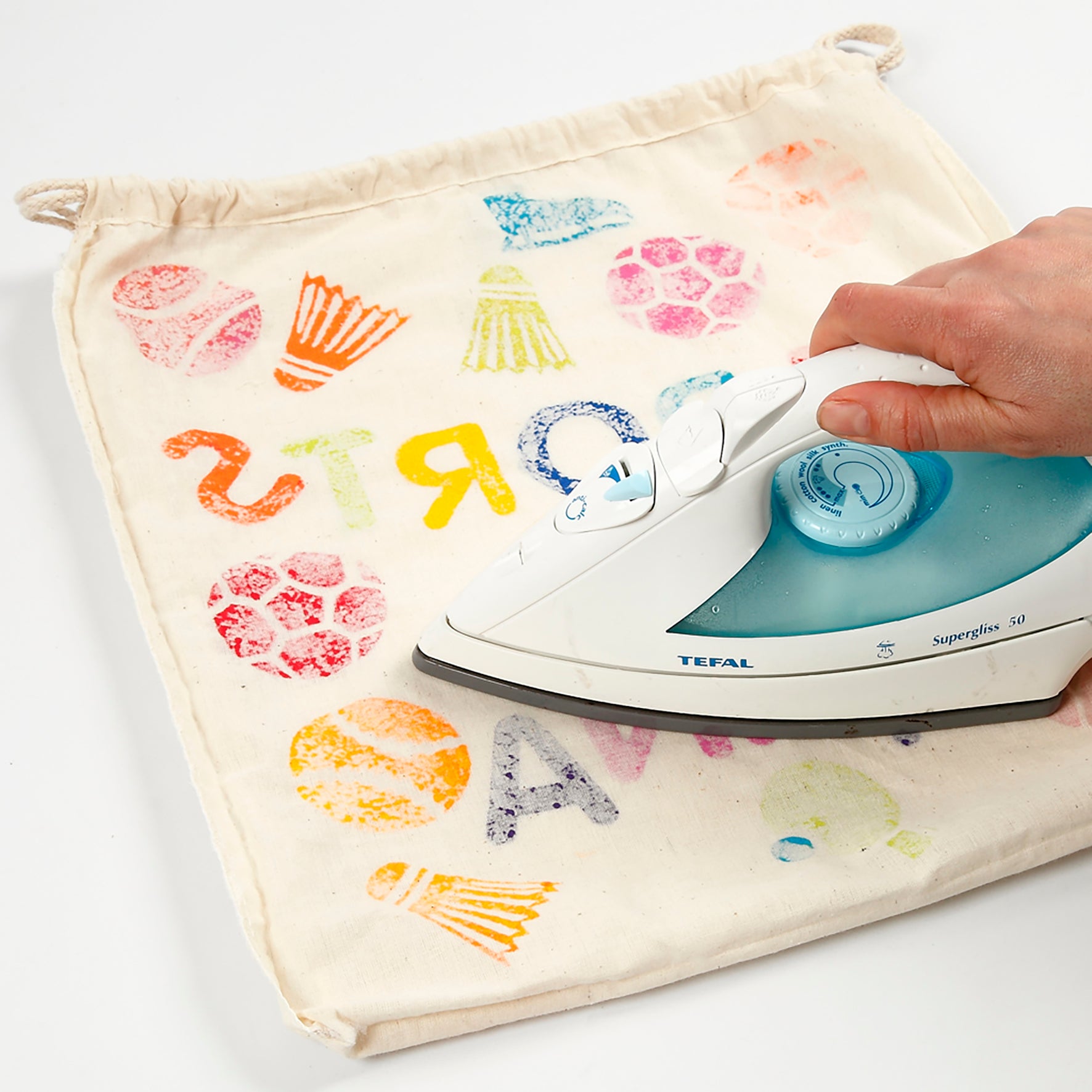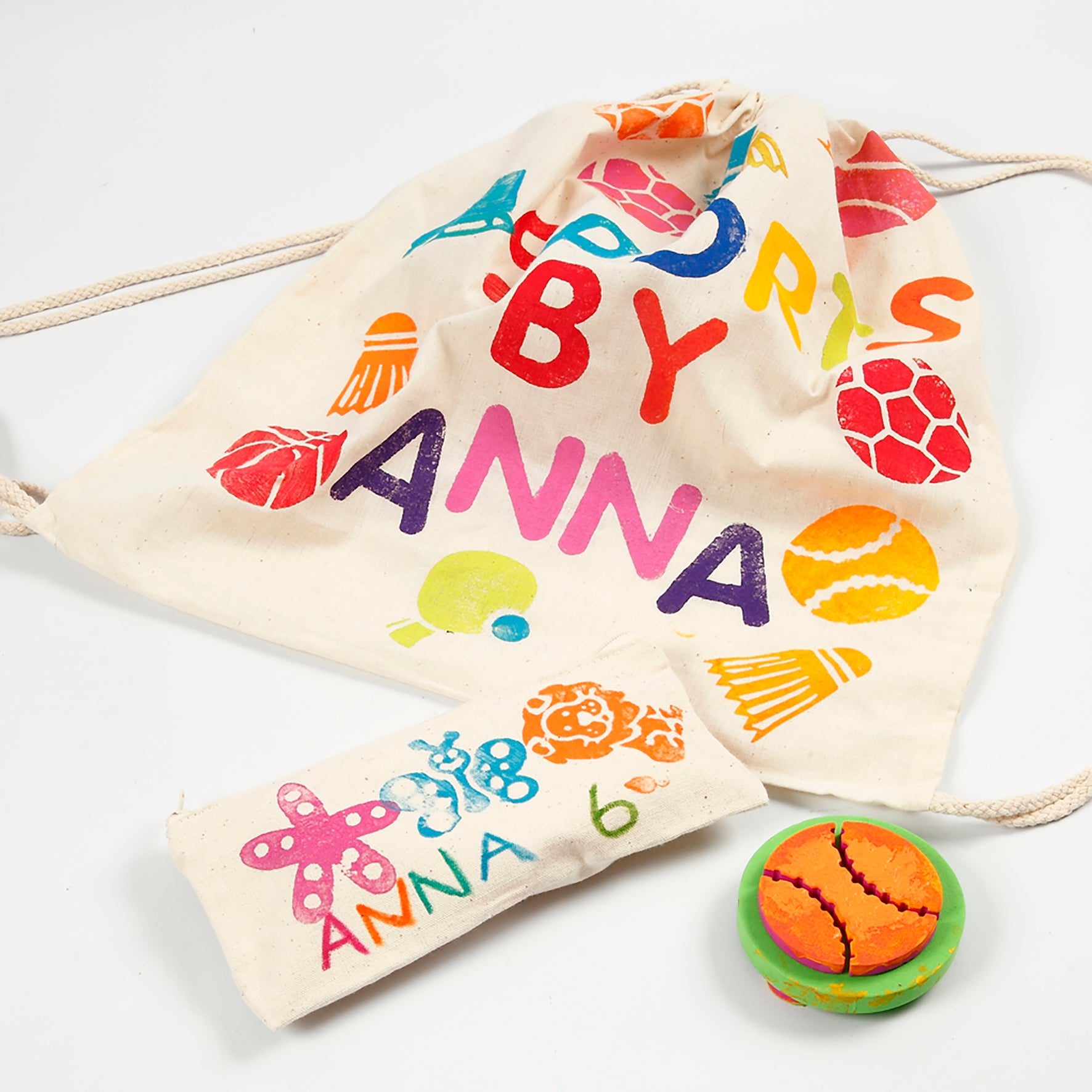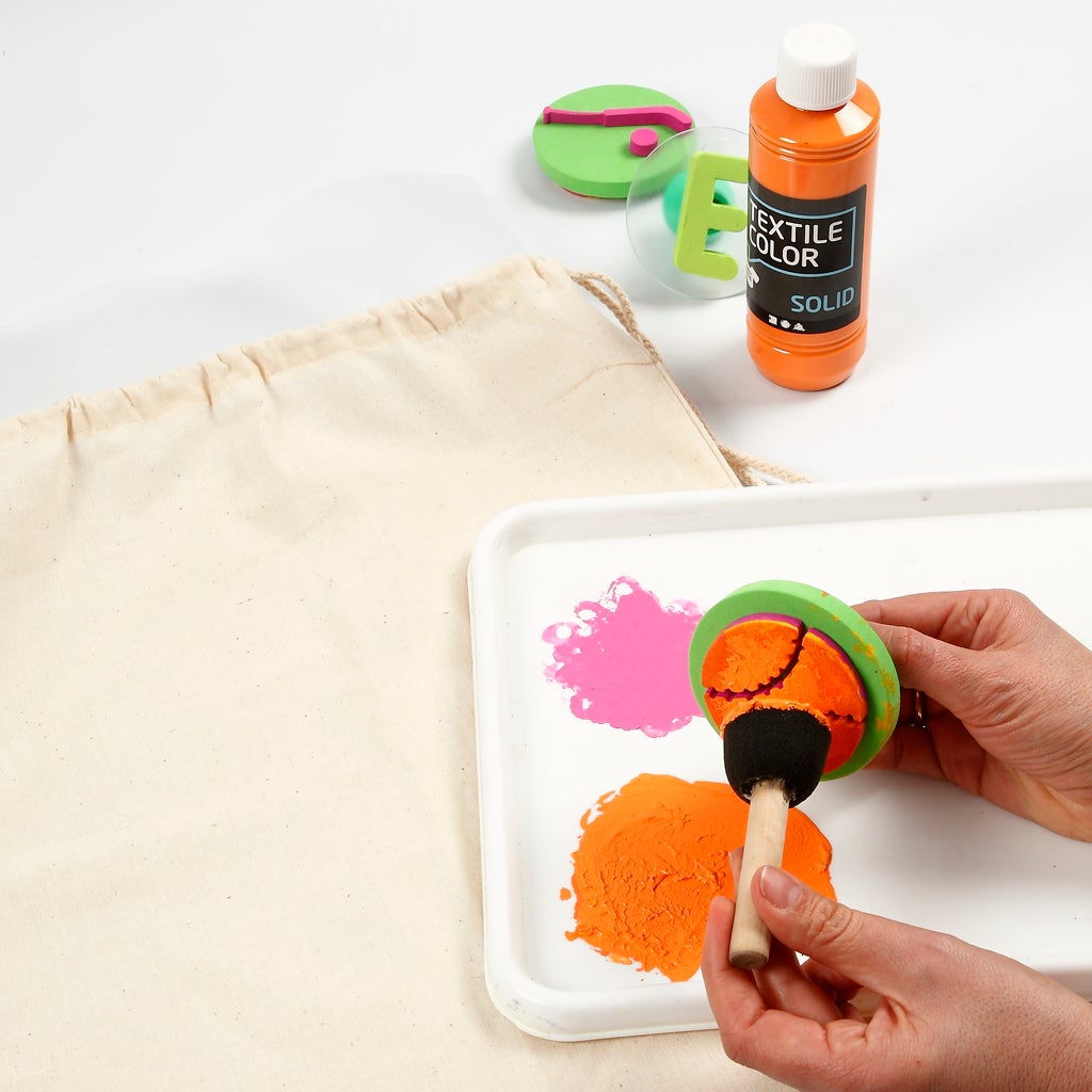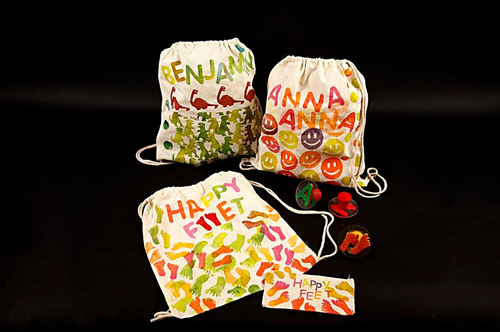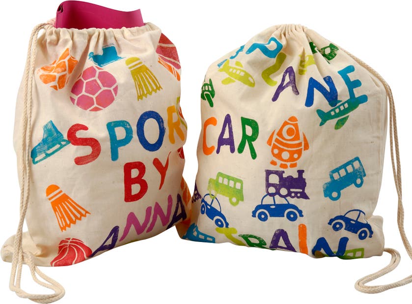 Använd lämpliga färger för textil som du kan måla eller trycka på påsarna. Låt fantasin flöda och skapa fantastiska mönster, och dekorera även med pärlor och paljetter.
