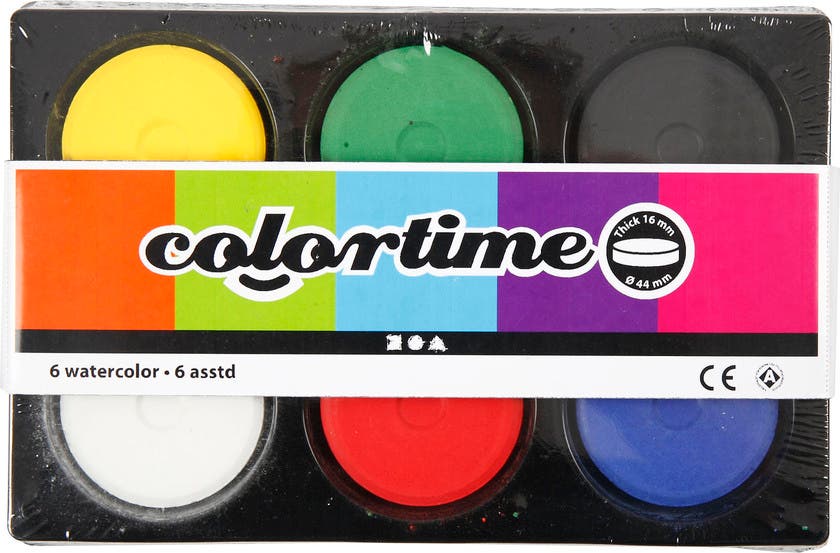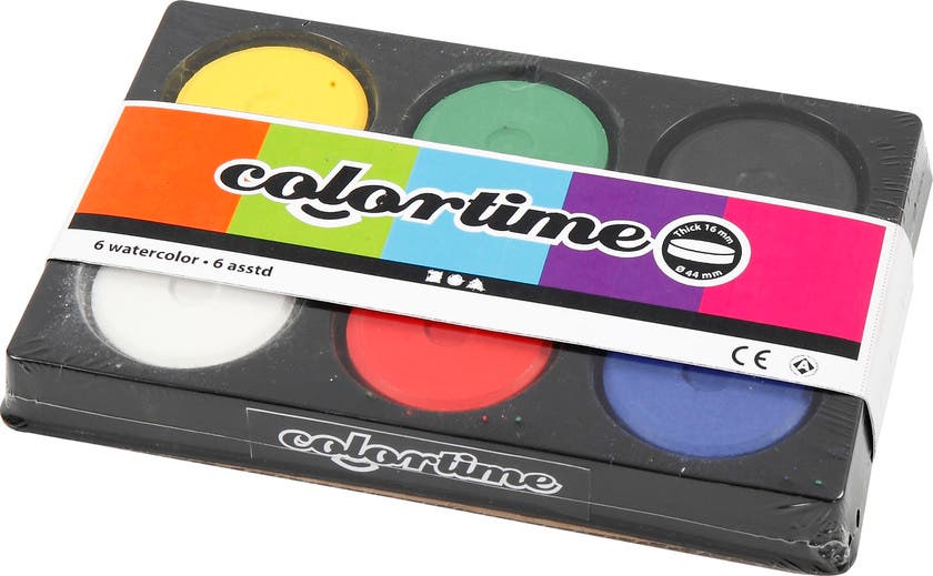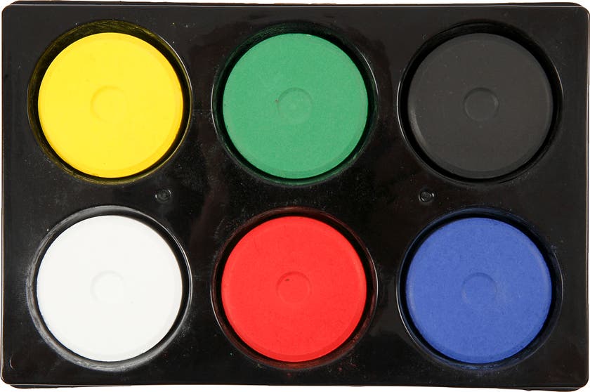 Paletten med temperablock i sex basfärger - helt täckande och tjockare än vanlig akvarellfärg. Vattenfärg/täckfärg i puckform som är vattenlösliga och kan spädas med vatten. Paletten kommer med ett transparent lock. Är uppbyggd att den också kan användas vid undervisning i färglära.
