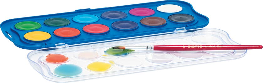 Giotto vattenfärger 12 färger. En ny typ av färgpalett som är lite upphöjd, vilket leder till att fukten stannar kvar och gör det lättare att samla upp färg på penseln. Det finns även små blandkoppar i locket för varje färg.