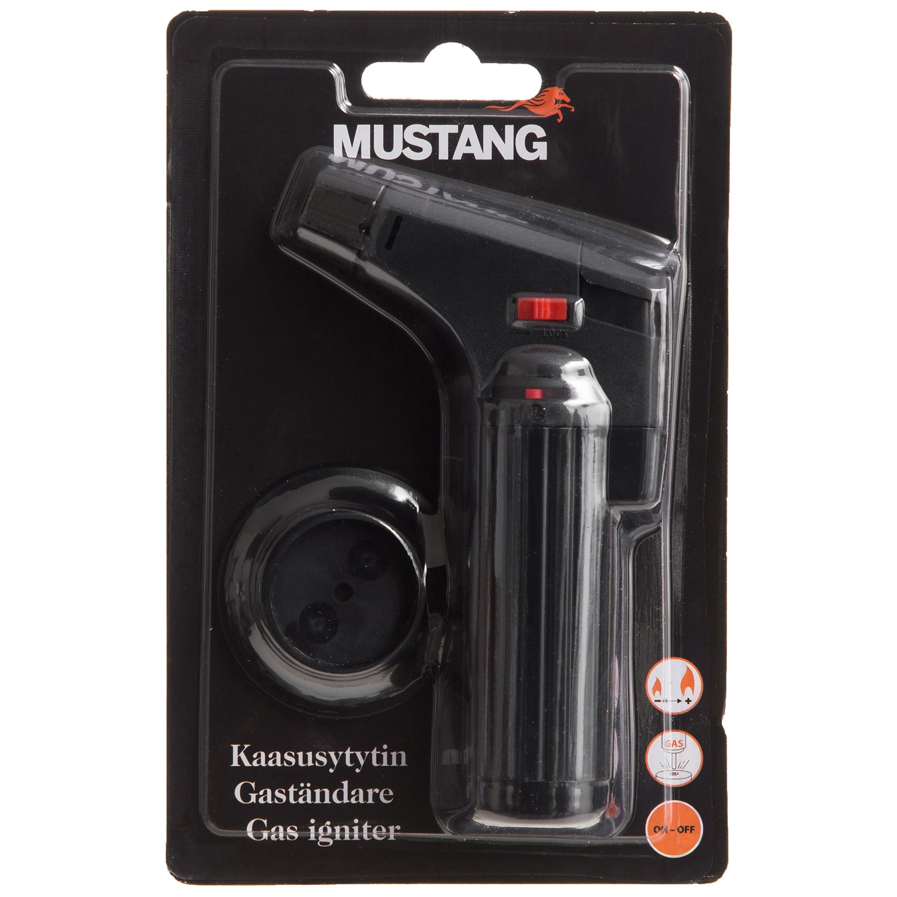 Jet Flame från Mustang är en kompakt gaständare av hög kvalitet. Tändaren har justerbar flamma och säkerhetsspärr. Levereras fylld med en mängd testgas och påfylls med tändargas. Perfekt för utflykten och överlevnadspackningen. Bra även för tändning av kallröksugn.