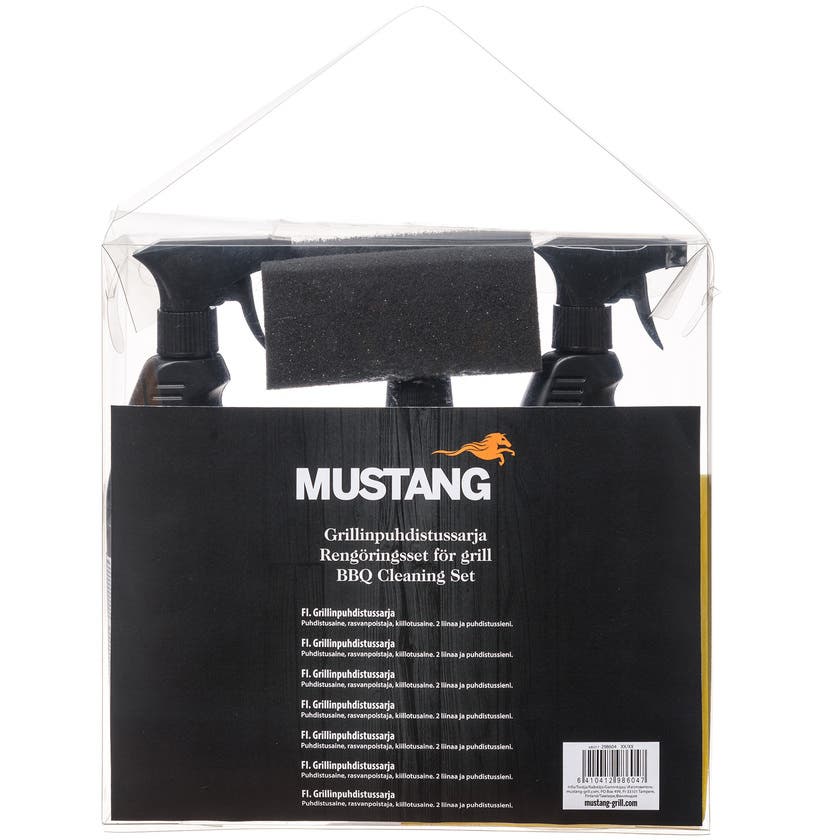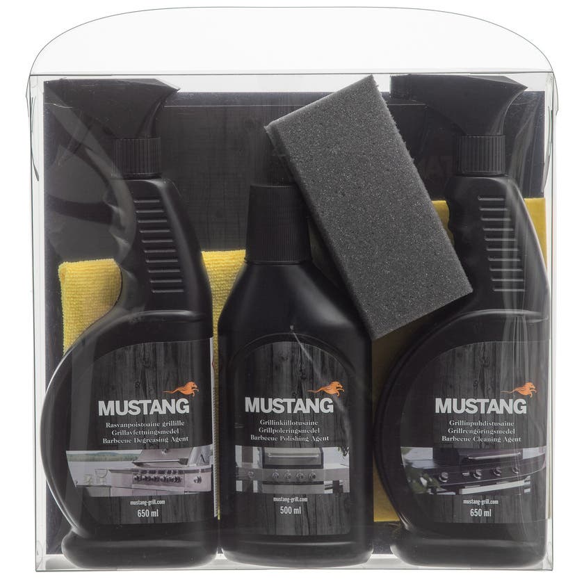 Från Mustang kommer detta behändiga rengöringsset för grillen – en ypperlig present för den intensiva grillaren! Det 6-delade setet innehåller grillrengöringsmedel, fettborttagare, poleringsmedel, rengöringssvamp och två mikorfiberdukar.