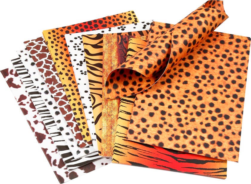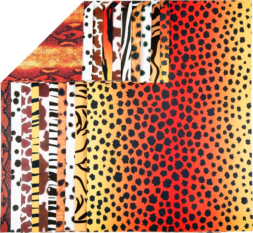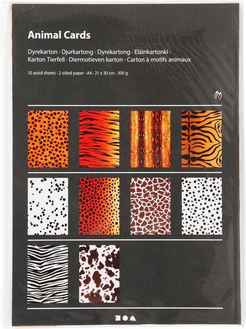 Mönstrad kartong med "djurtryck" i A4-format, med mönster på båda sidorna. Mönstrade ark med mönster efter olika vilda djur, färdiga för att börja skapa djur eller andra effektfulla detaljer i ditt dekorativa pysslande.