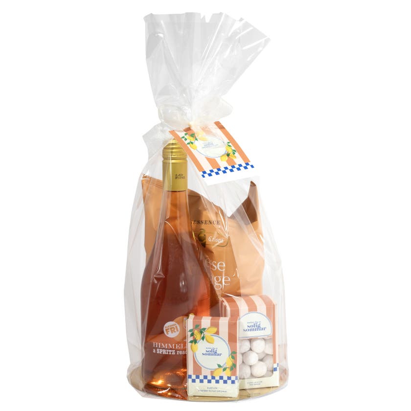 En härlig alkoholfri Spritz-dryck som förenar klassiska italienska Spritz-ingredienser med skandinavisk smakdesign. Drycken är baserad på kolsyrat premiumkällvatten och är redo att serveras kyld. Njut av den bubblande drycken tillsammans med krispiga chips med ostsmak, samt mjuka toffeebollar som ger en söt avslutning – allt tillsammans med en kortlek för extra underhållning. Presentsetet är paketerat i cellofan med ett matchande band i organza.