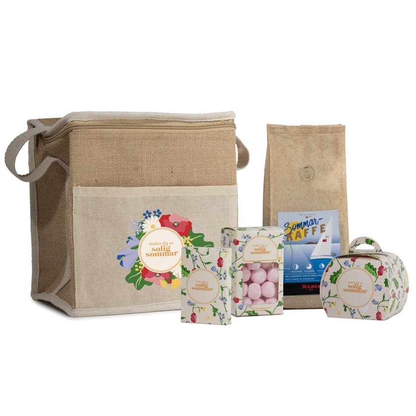 Midsommarkit med smarriga fikabites från Delicato, ett mellanmörkt kaffe med rika toner av choklad, valnöt och citrusskal, somriga jordgubbskulor som ger en frisk och söt avslutning, samt en kortlek för att skapa extra stämning till fikastunden. Allt levereras i en stilsäker kylväska i jute och canvas med en frontficka.
