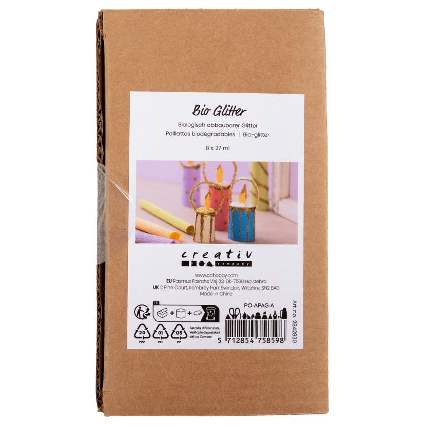 Biologisk nedbrytbart glitter med en massa glittereffekt. Storlek 0,4mm. Tillverkad av cellulosa som är utvunnet från eukalyptusträ som odlat ansvarsfullt och kontrollerat. 100 % plastfri. Använd den i hobbyarbeten som ersättning till vanligt glitter. Burk med 27ml. Med vårt biologiskt nedbrytbara glimmer kan du enkelt skapa vackra glittereffekter för dina pysselprojekt. Perfekt för dekoration av trä, kartong, papper och annat. Komposterbart, bryts ned naturligt i vatten över tid. Du använder biologiskt nedbrytbart glimmer på samma sätt som vanligt glitter. Strö det till exempel över våt färg, lim eller dubbelhäftande tejp eller blanda det i vår Sticky Base. Tänk bara på att det föreligger risk för färgblödning från det biologiskt nedbrytbara glimmret om det blandas direkt med vattenhaltiga/flytande produkter eller om det strös på långsamt torkande föremål som t.ex. handgjort papper.