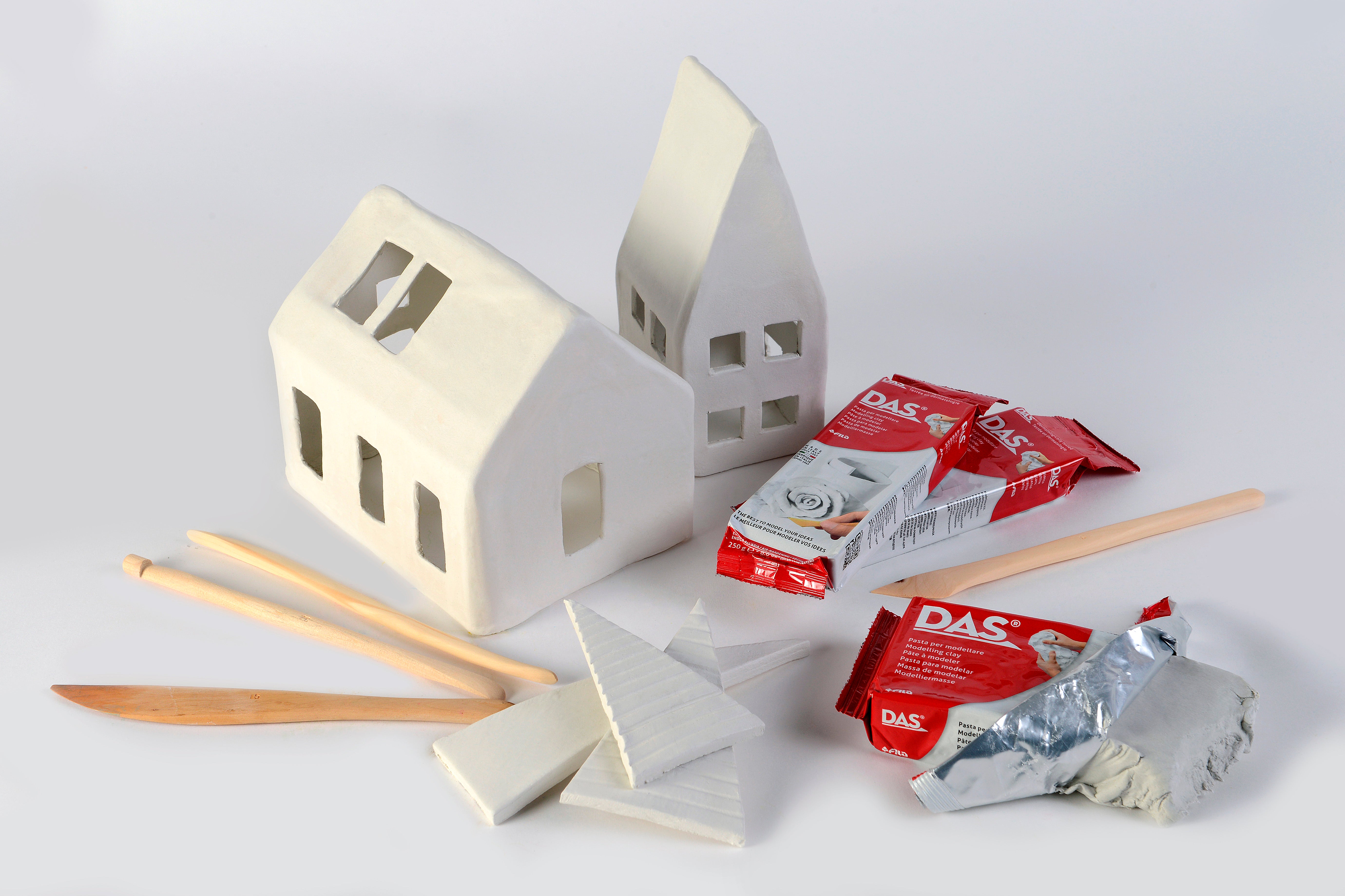 DAS modellera har en mjuk och len struktur som är lätt att knåda. Lufttorkande (24 h/cm). Behöver inte brännas. Krymper i olika rumstemperaturer och på vilket underlag leran placerats på.