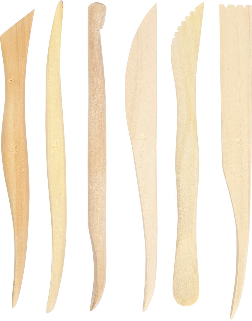 Set med 6 st dubbelsidiga modelleringspinnar som ger dig 12 olika verktyg att jobba med. Pinnarna är välarbetade och träet polerat för att vara sköna att hålla i och underlätta modelleringen av alla typer av lera.