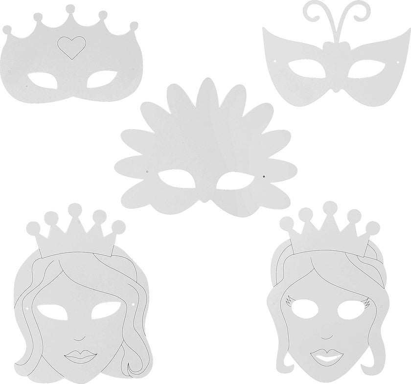 Äventyrmasker i utstansade figurer av kraftig vit 230 g kartong. Masker för maskeraden, skapa din personliga mask. Barn älskar att få klä ut sig, speciellt när det är kalas, fest och maskerader. Alla små prinsessor, läskiga figurer kommer att gilla att göra sina egna masker till kalaset.