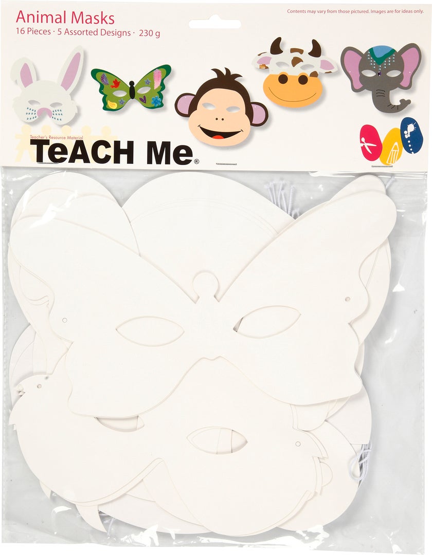 Utstansade djurmasker av kraftig vit kartong. Elastiskt snöre ingår. Förpackning med 5 mixade designer.