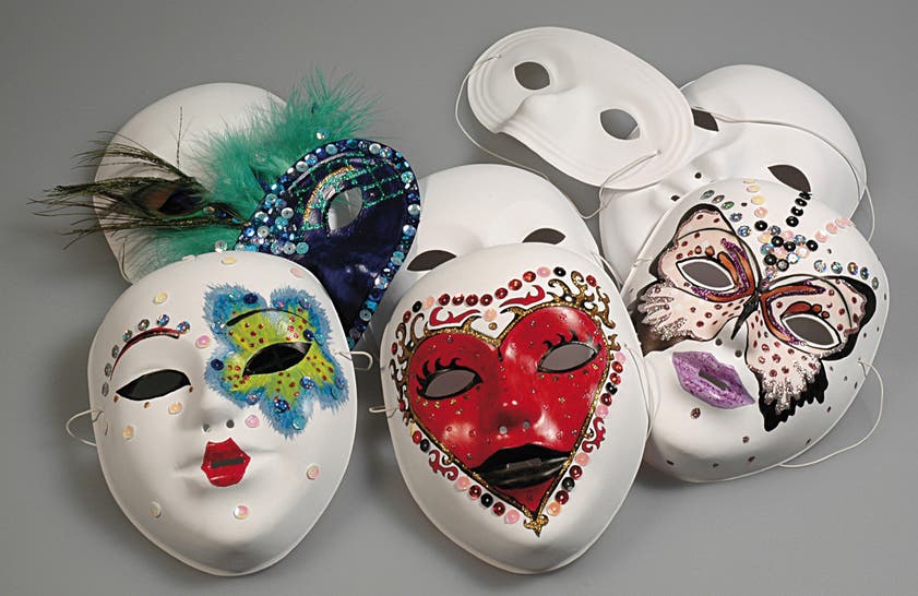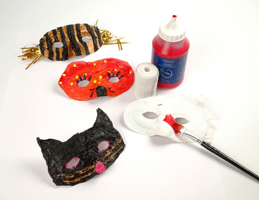 Här finns inga begränsningar med vilka motiv du ska välja - låt fantasin flöda med penseln, pennan, kritan och använd sax och lim för att klippa ur bilder och mönster från tidningar, bilder, tyger mm. Skapa det du behöver för olika teman på maskeraden, kalaset och vardagsleken. Nu kan du bli vem som helst, prinsessan eller prinsen, spöket på Halloween, rovdjuret, kändisen m.m. CE-märkta.