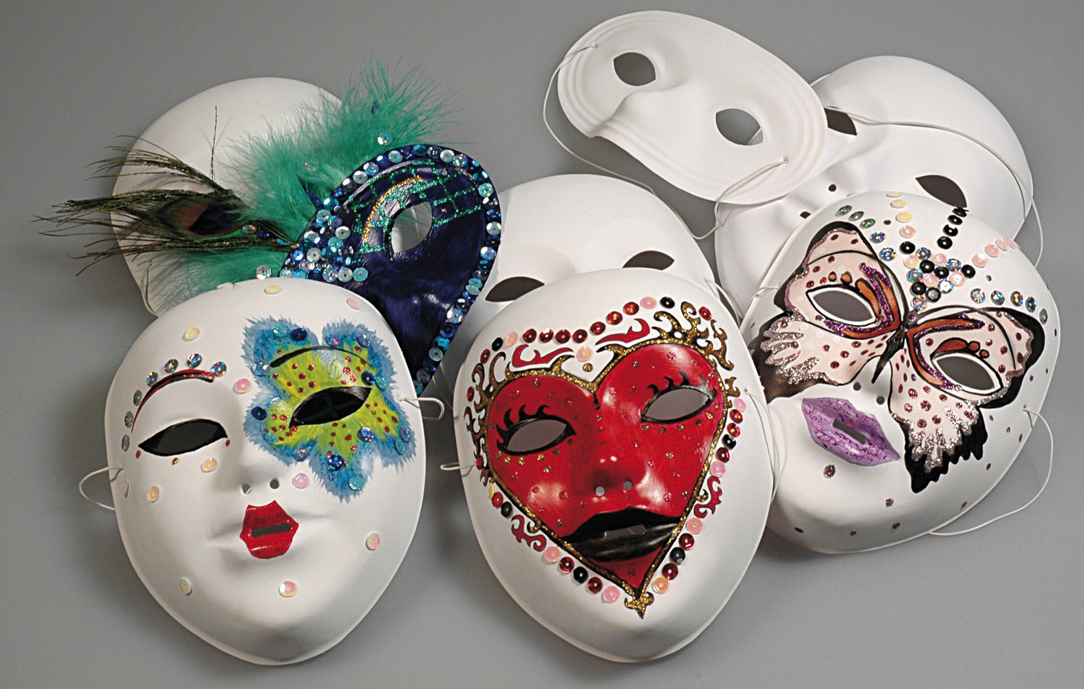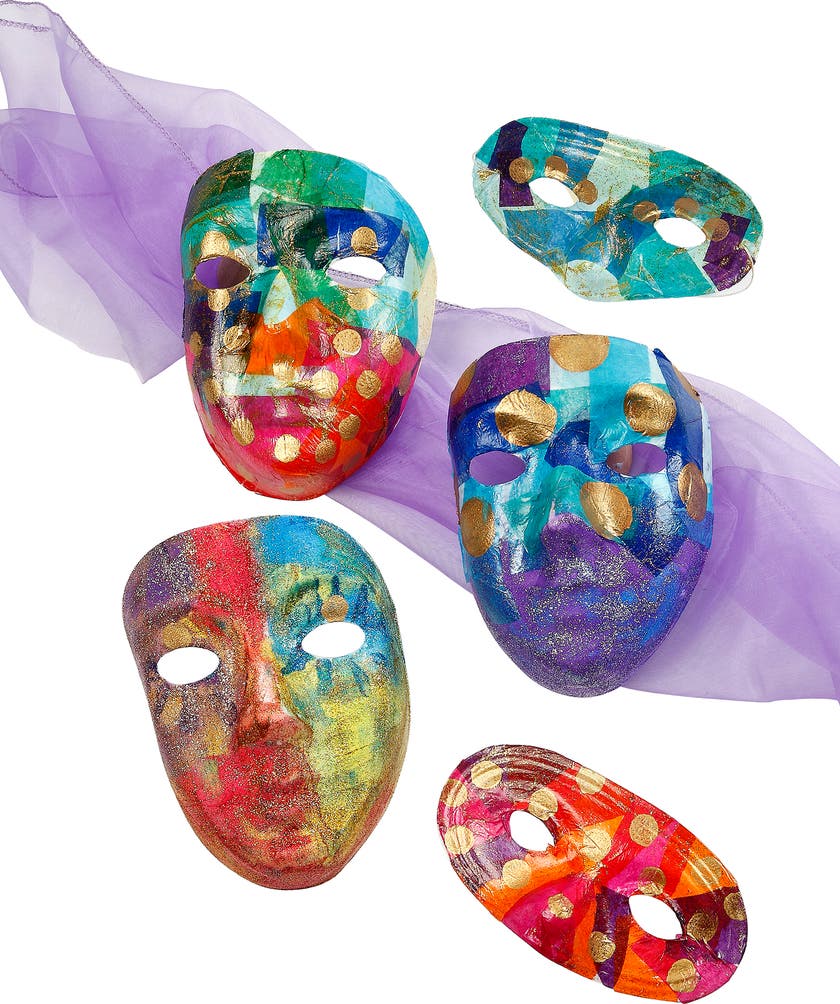 Här finns inga begränsningar med vilka motiv du ska välja - låt fantasin flöda med penseln, pennan, kritan och använd sax och lim för att klippa ur bilder och mönster från tidningar, bilder, tyger mm. Skapa det du behöver för olika teman på maskeraden, kalaset och vardagsleken. Nu kan du bli vem som helst, prinsessan eller prinsen, spöket på Halloween, rovdjuret, kändisen m.m. CE-märkta.