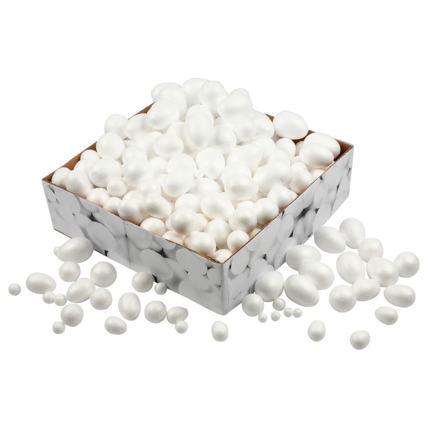 Styrolitkulor och -ägg i storlek 1,5-6,1cm. Måla dem eller dekorera med lera och paljetter. 550 st mixade/förpackning. Komplett sortiment med 4 storlekar styrlolitkulor och 3 storlekar styrolotägg.