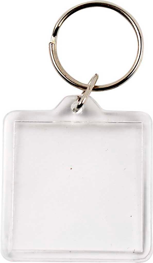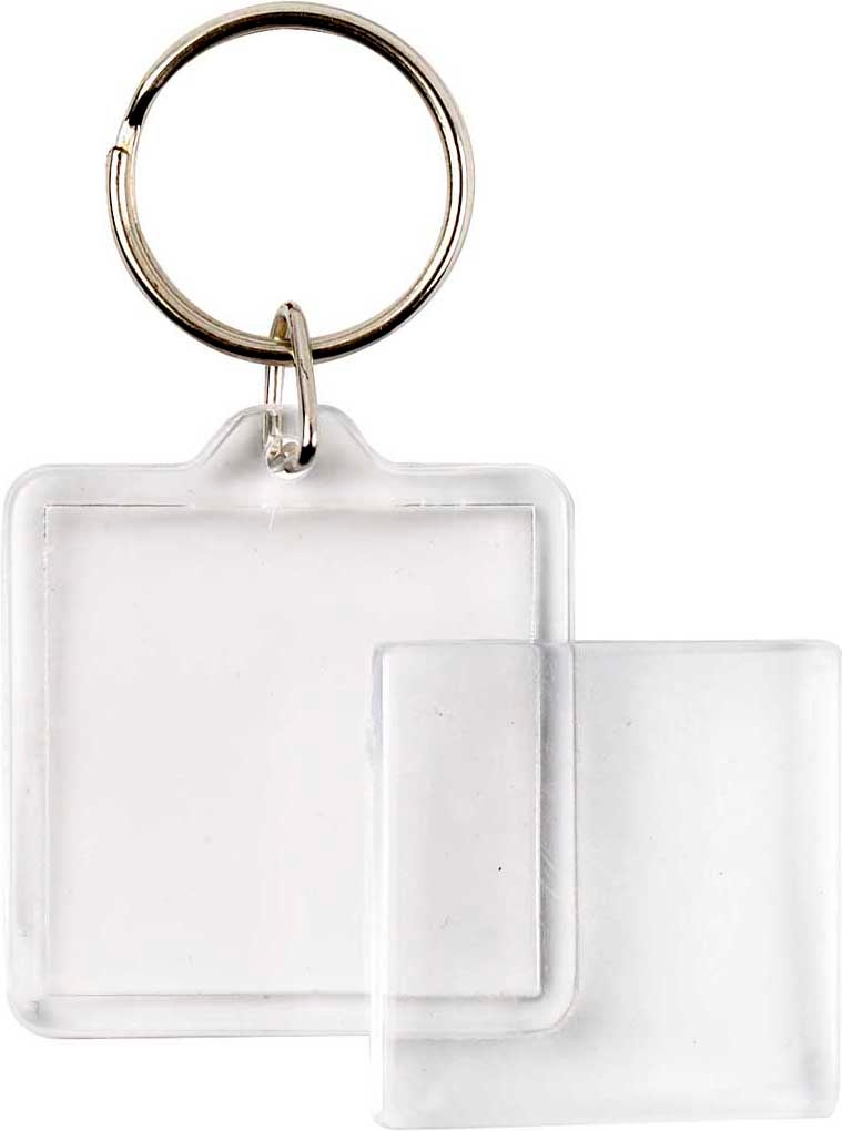 Nyckelringar med kvadratiska tvådelade halvor i klar akryl där du kan sätta in dina egna bilder eller foton. Dekorera även nyckelringen med egengjorda berlocker.