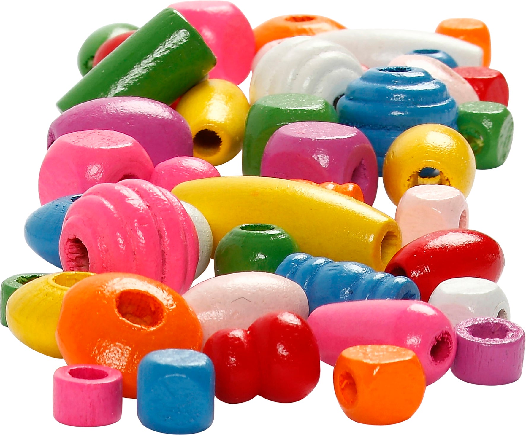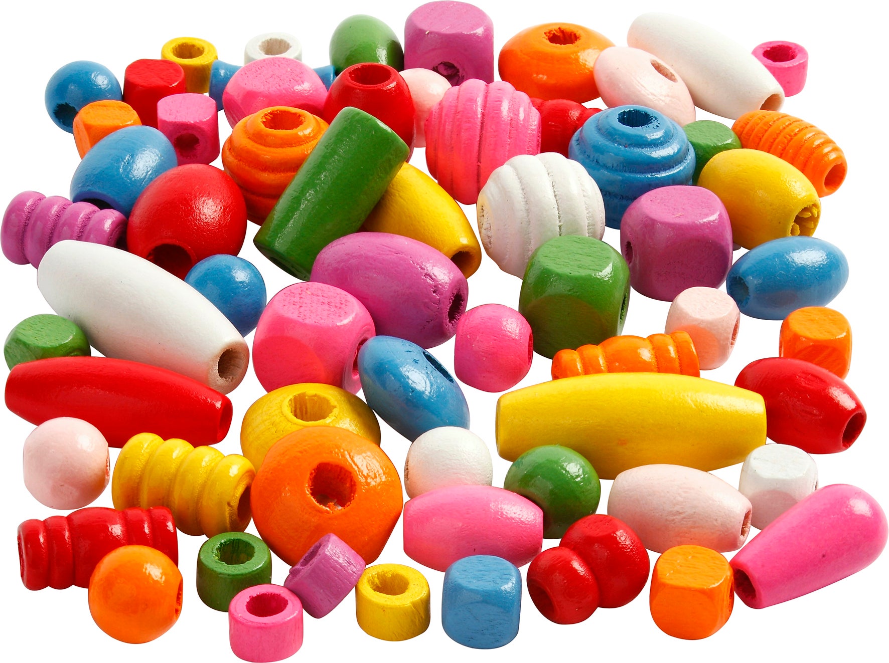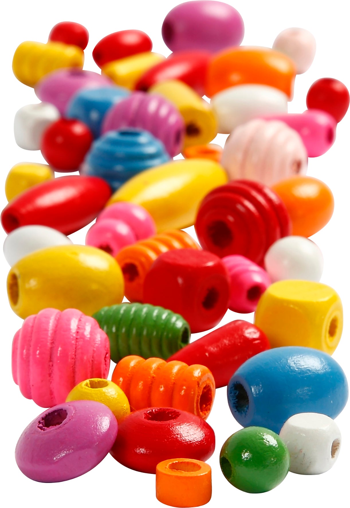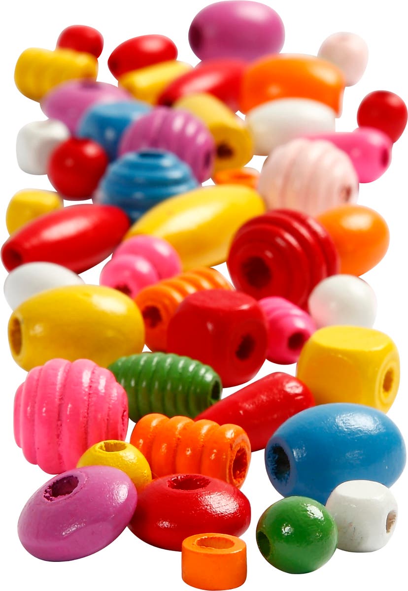 Mixade färgglada och roliga träpärlor i olika former och storlekar. Levereras i plastburk. CE-märkta.
