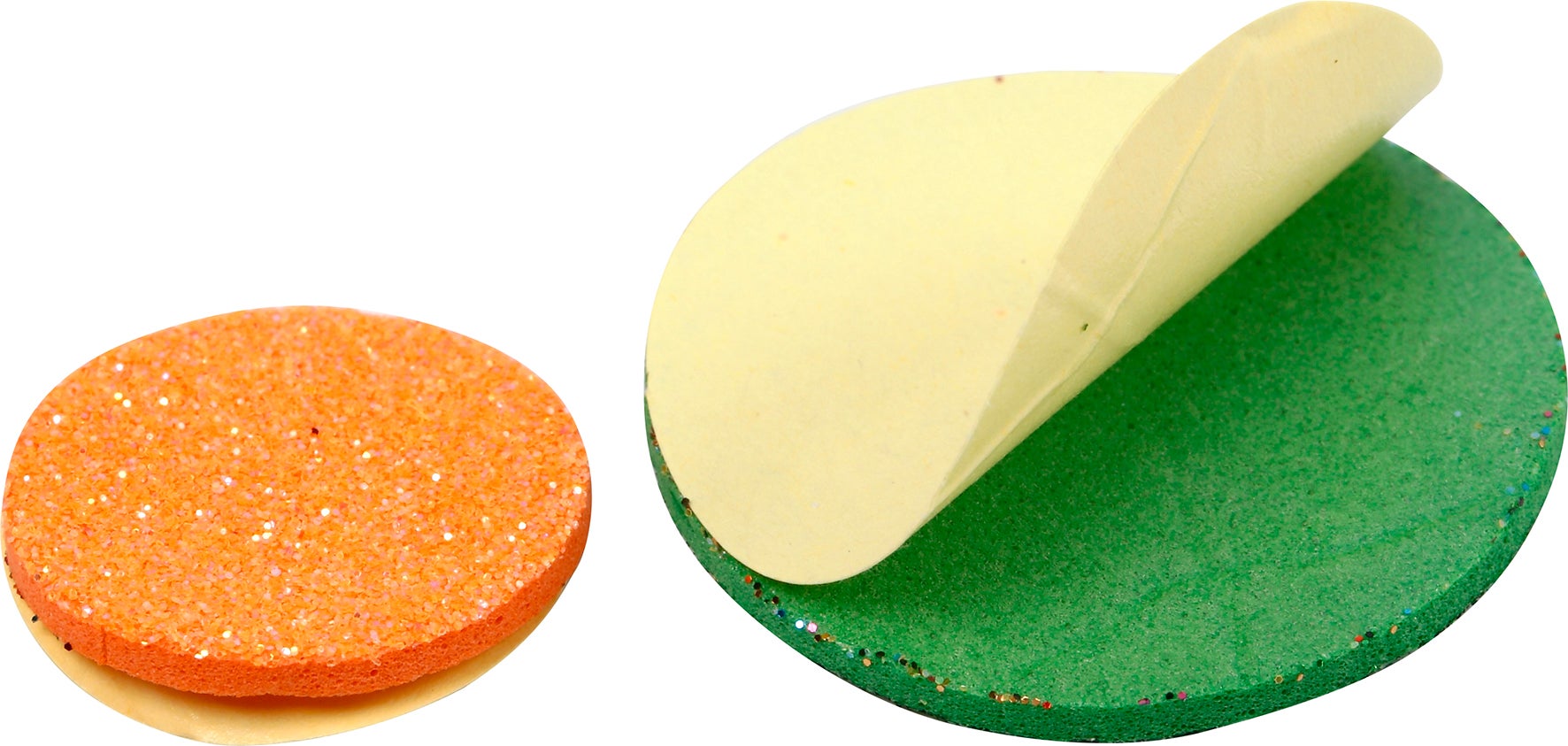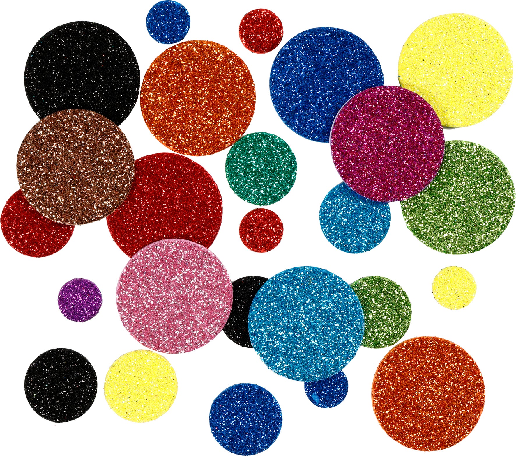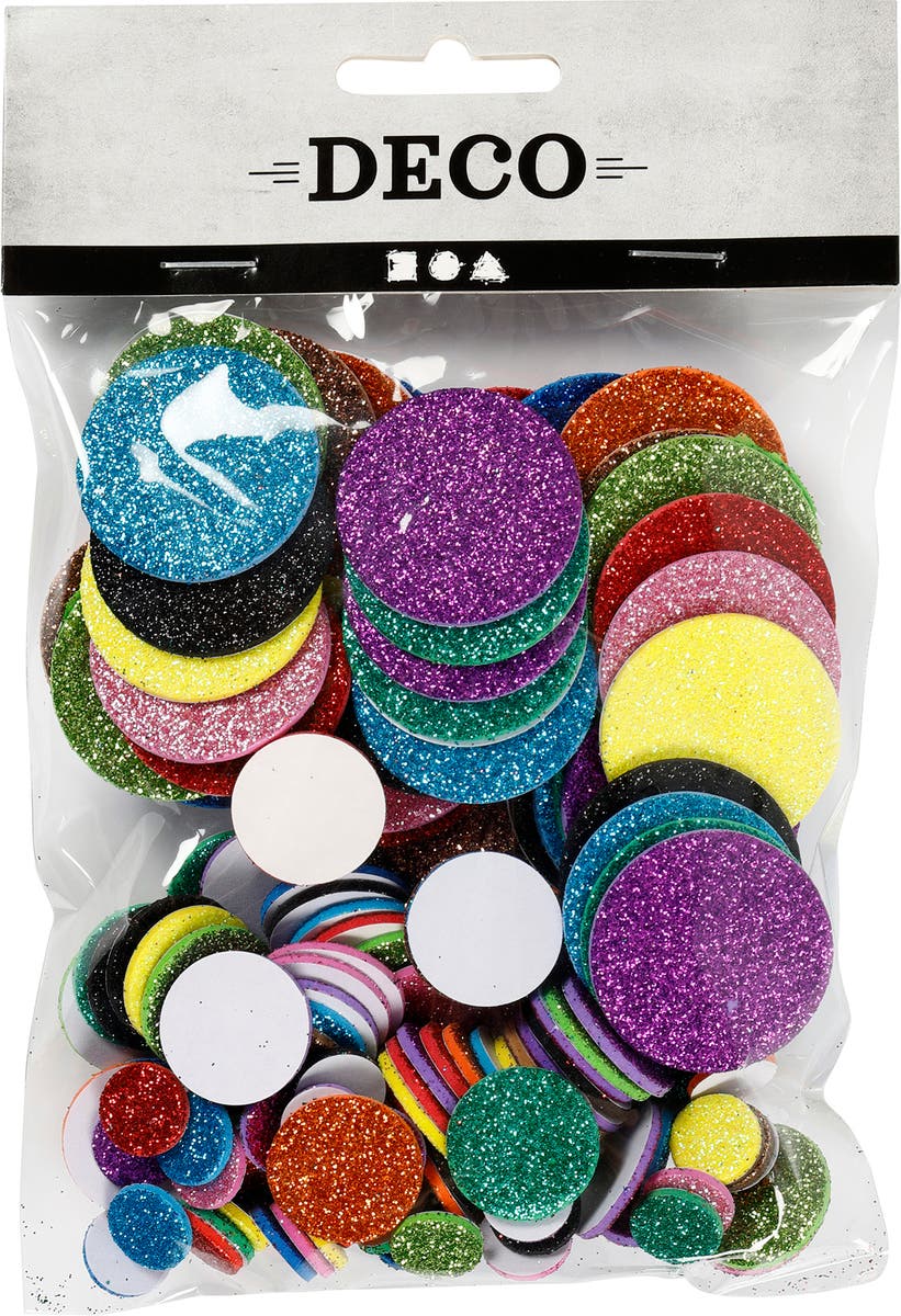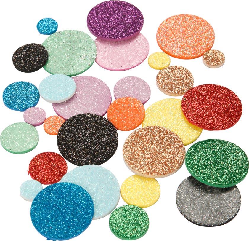 Självhäftande och utstansade cirklar med glitter i mjuk och skumaktigt material. Lämplig till olika typer av dekorationer.