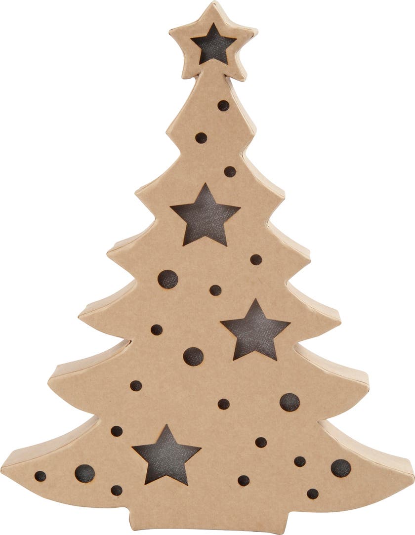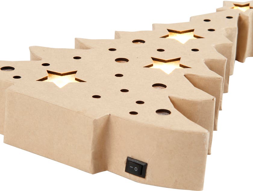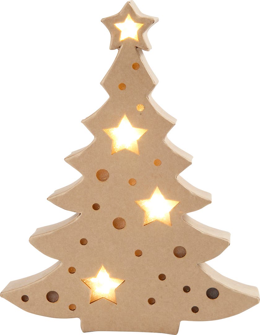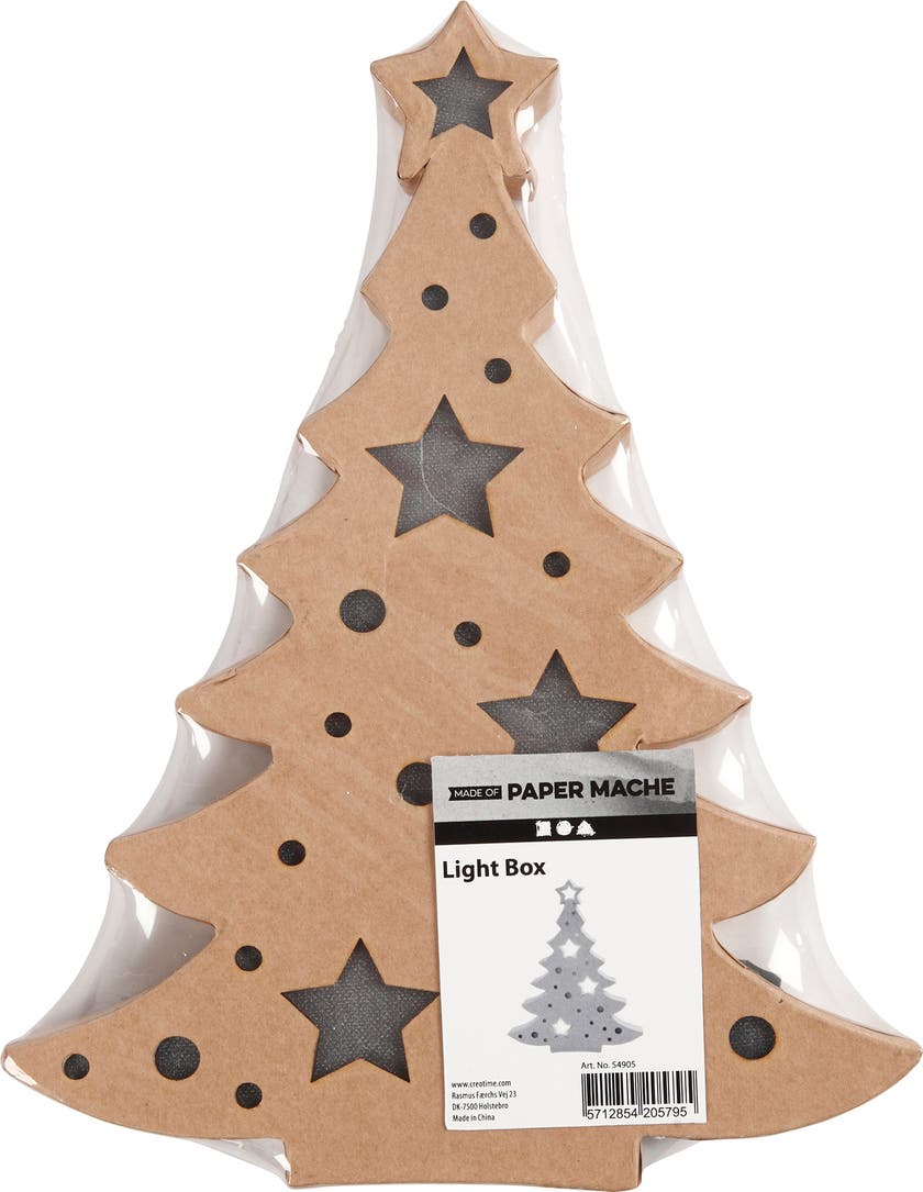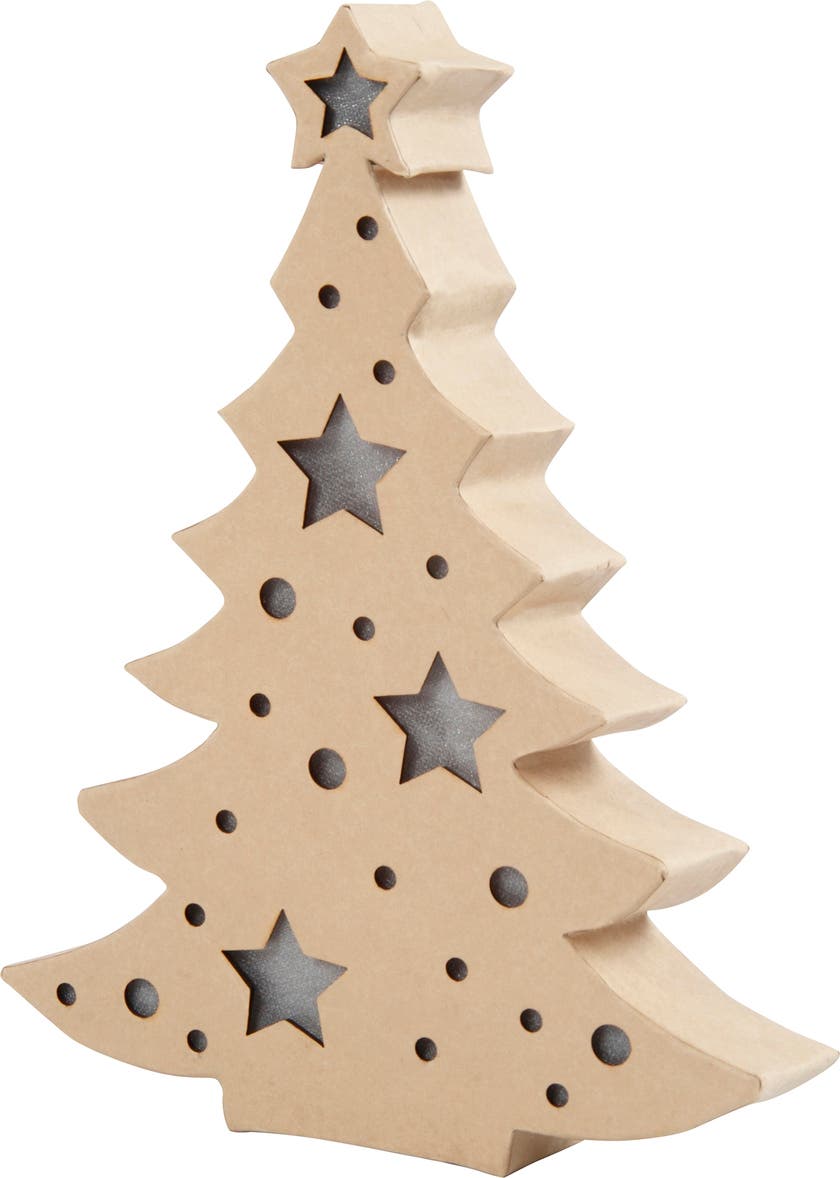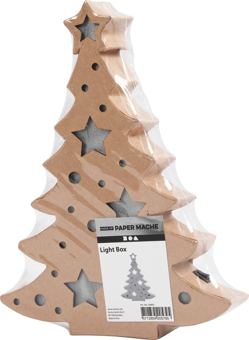 Ett kreativt pyssel inför julen - Julgran med inbyggt ljus - Platt figur av papier-maché med batteridrivna ljus. Kan stå fritt och har en inbyggd batteribox på baksidan och knapp för att tända och släcka. Ger ett varmt ljus genom utskärningarna som är täckta med ett transparent tyg. CE-märkt. * Mått: H: 27x B: 21,5 x djup 4 cm * Använd 2 AA batterier (medföljer inte)
