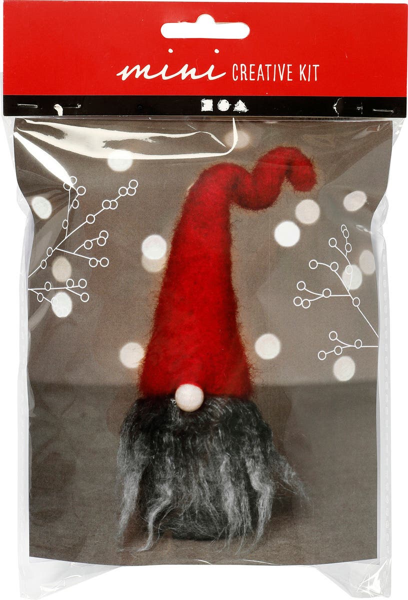 Innehåll: Röd och grå ull, skägg, träpärlor, frigolitkropp, filtnål och nålfiltsplatta. Beskrivning medföljer. Storleken anger den färdiga produktens mått.