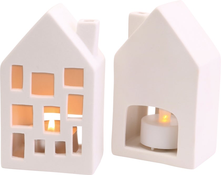 Charmiga och eleganta ljushus till värmeljus. De små husen har dekorativa fönster så att ljusets sken kan sprida sig. Sätt en personlig prägel på huset genom att måla med hobby- eller keramikfärg. De kan också dekoreras med exempelvis effektliner, decoupage, glitter m.m. Bara fantasin sätter gränsen! Roligt pyssel för stora och små. Varför inte ge bort som en väldigt personlig present?