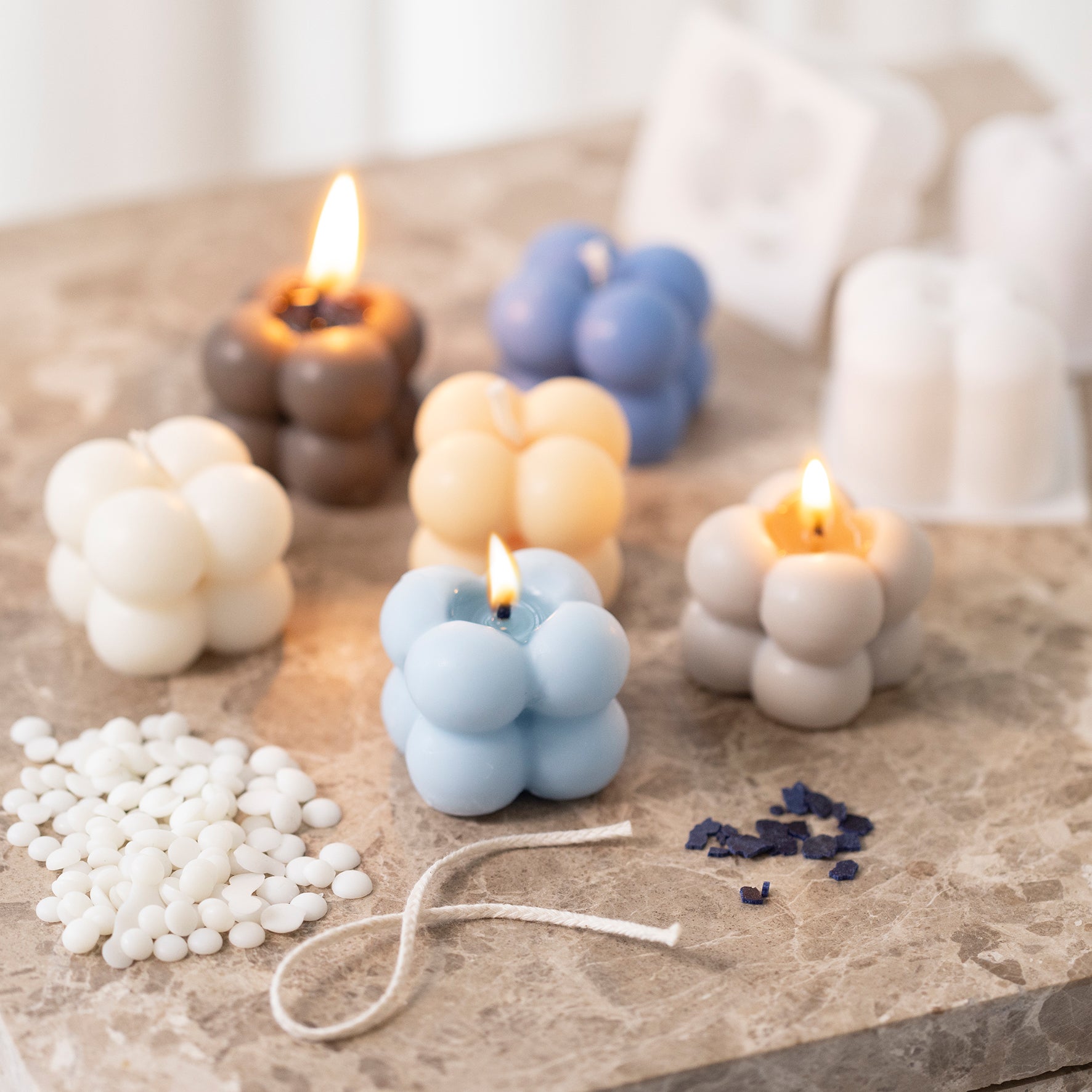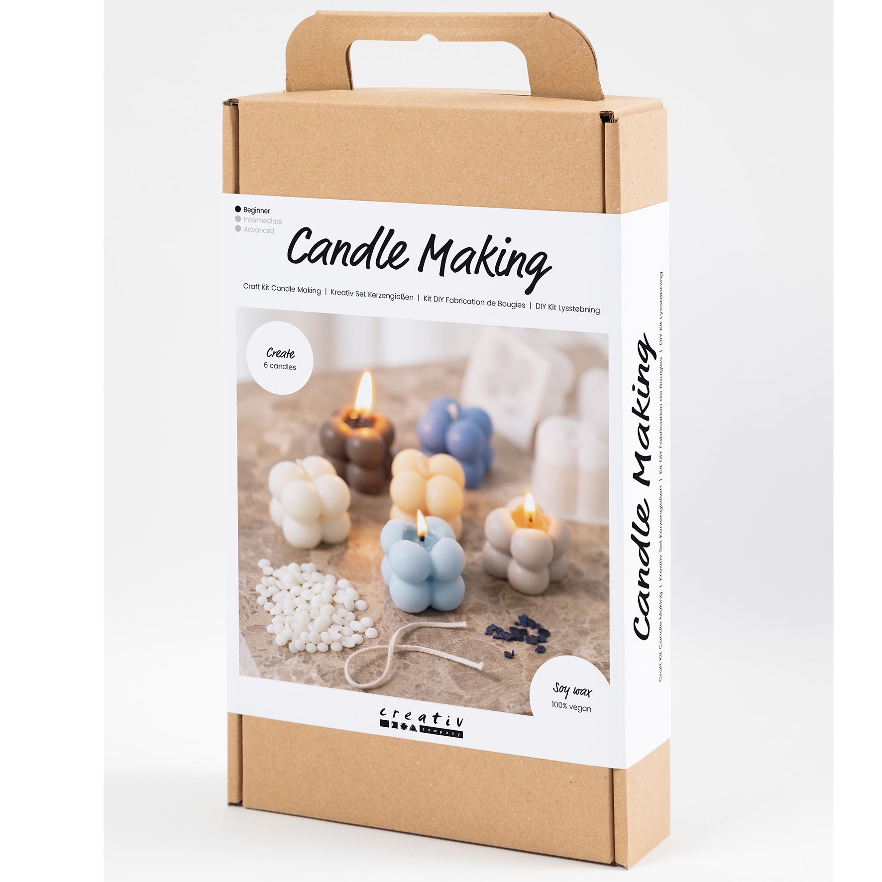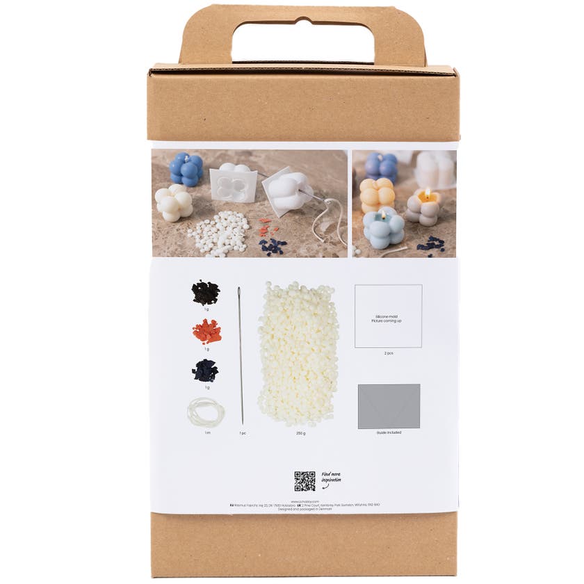 Skapa dina egna bubbelljus med detta ljusstöpningsset från Creativ Company. Förpackningen innehåller material för tillverkning av sex ljus. Alla instruktioner du behöver medföljer. Om du älskar de populära bubbelljusen som finns ute i handeln idag lämpar sig det här kitet utmärkt för dig. Ljusen stöps av 100% veganskt sojavax – ett naturmaterial som avger 80–90% mindre sot än vanliga ljus. Du kan även färga ljusen i blått, vitt och beige. De här bubbelljusen passar i alla interiörer. Tänd ljusen för en mysig stämning eller använd dem som dekoration på ett bord eller en hylla.