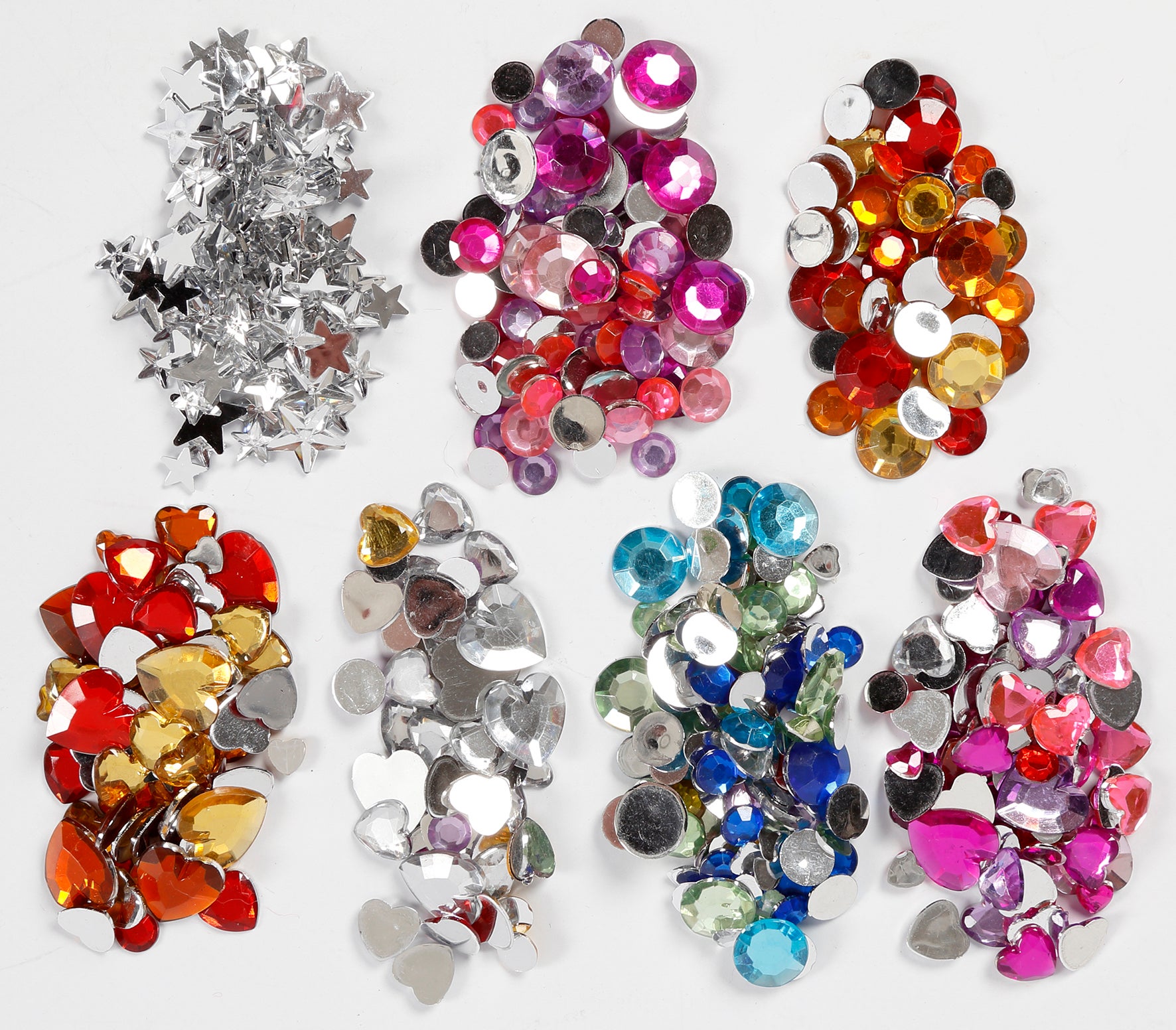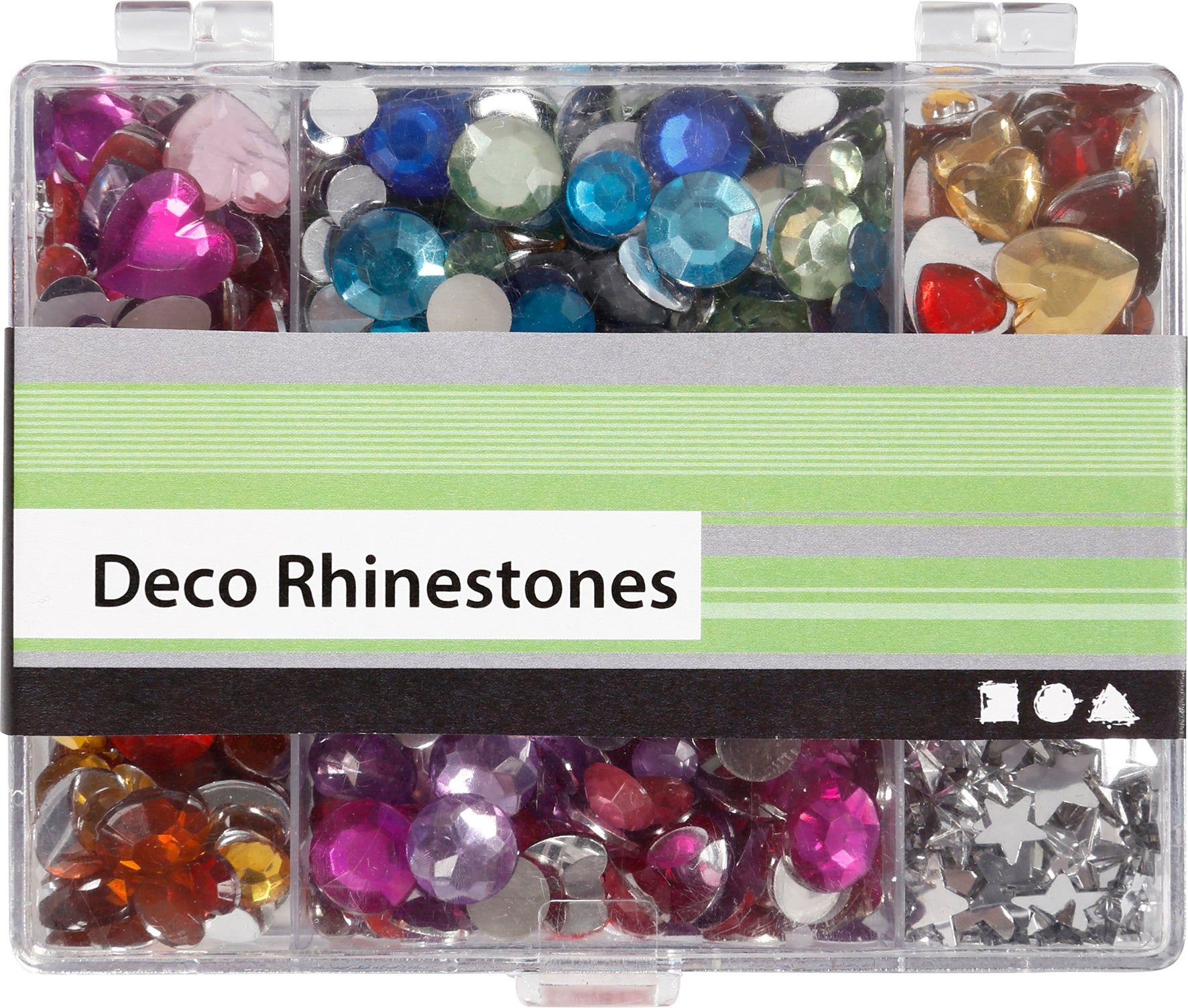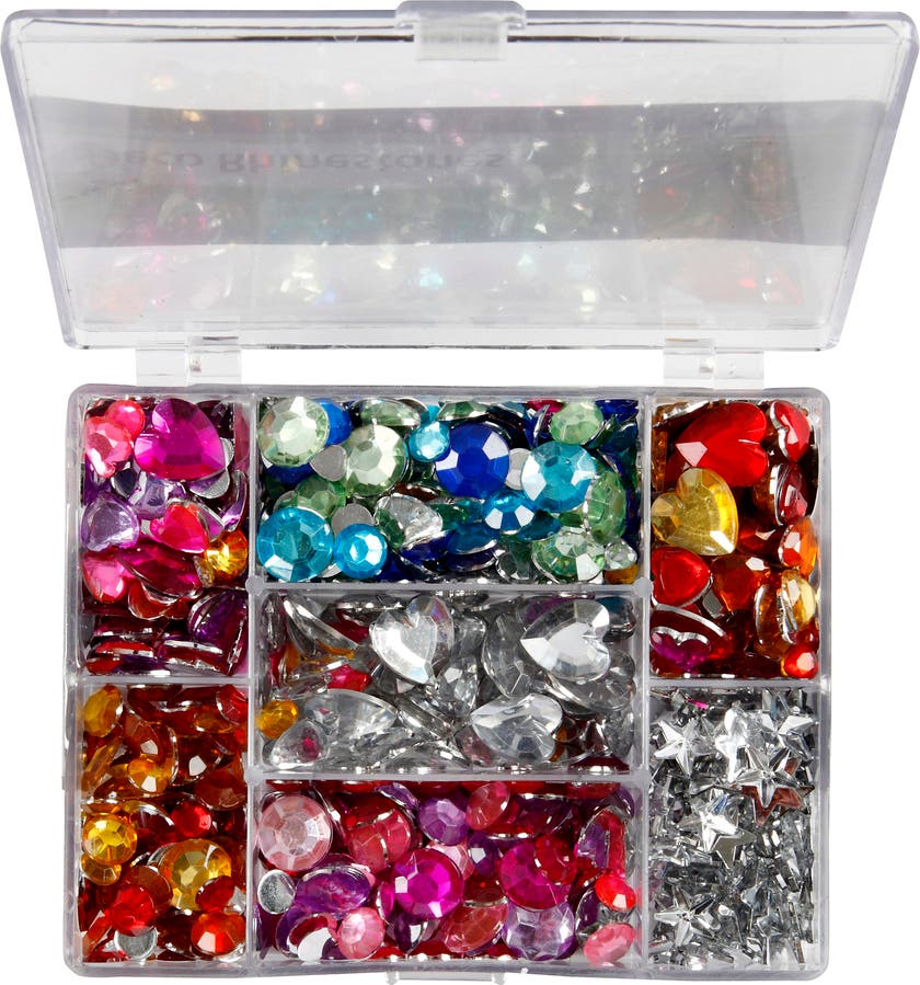 Blandade rhinstenar med platt baksida. Totalt 3 designer à flera storlekar och färger i klar ask med praktisk fackindelning och lock.