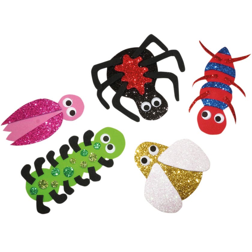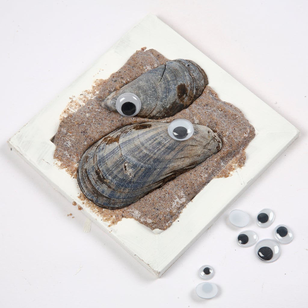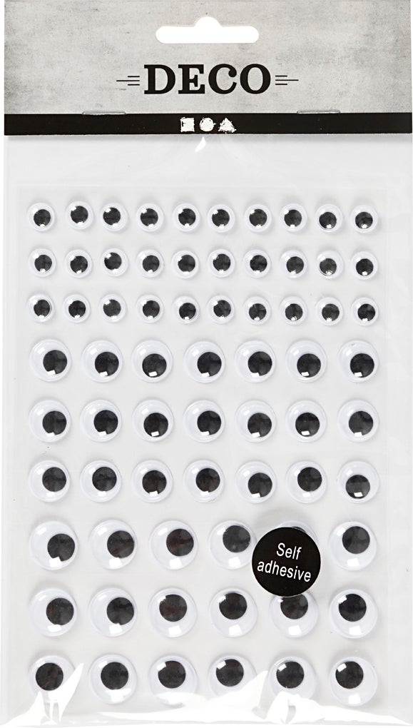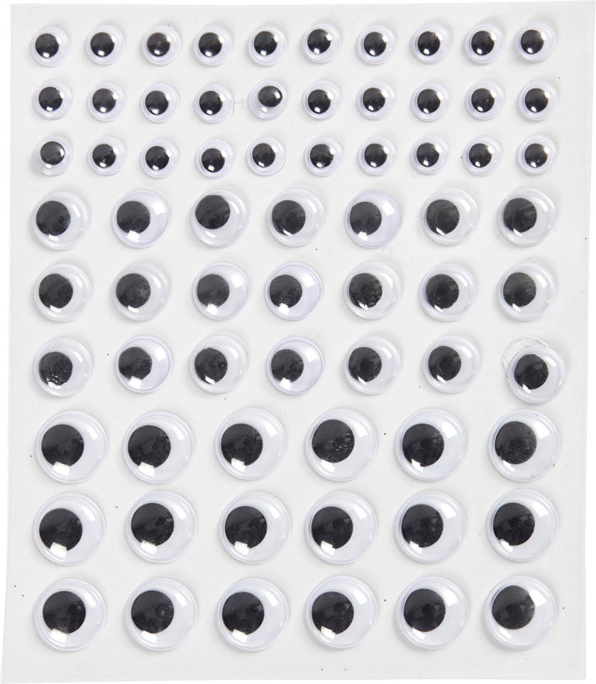 Ark med självhäftande rullögon i 3 storlekar. Alla ögon är runda och vita med svarta, rörliga pupiller bakom genomskinlig plast.