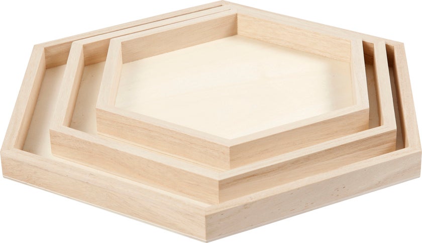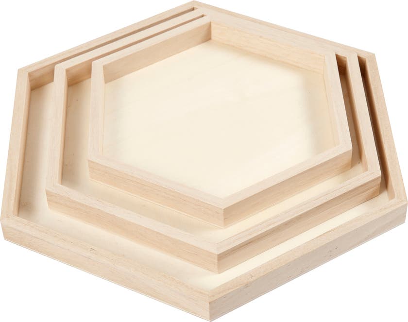 Bricka i trä för dekoration. Sexkantiga brickor av ljust kejsarträ för dekoration.