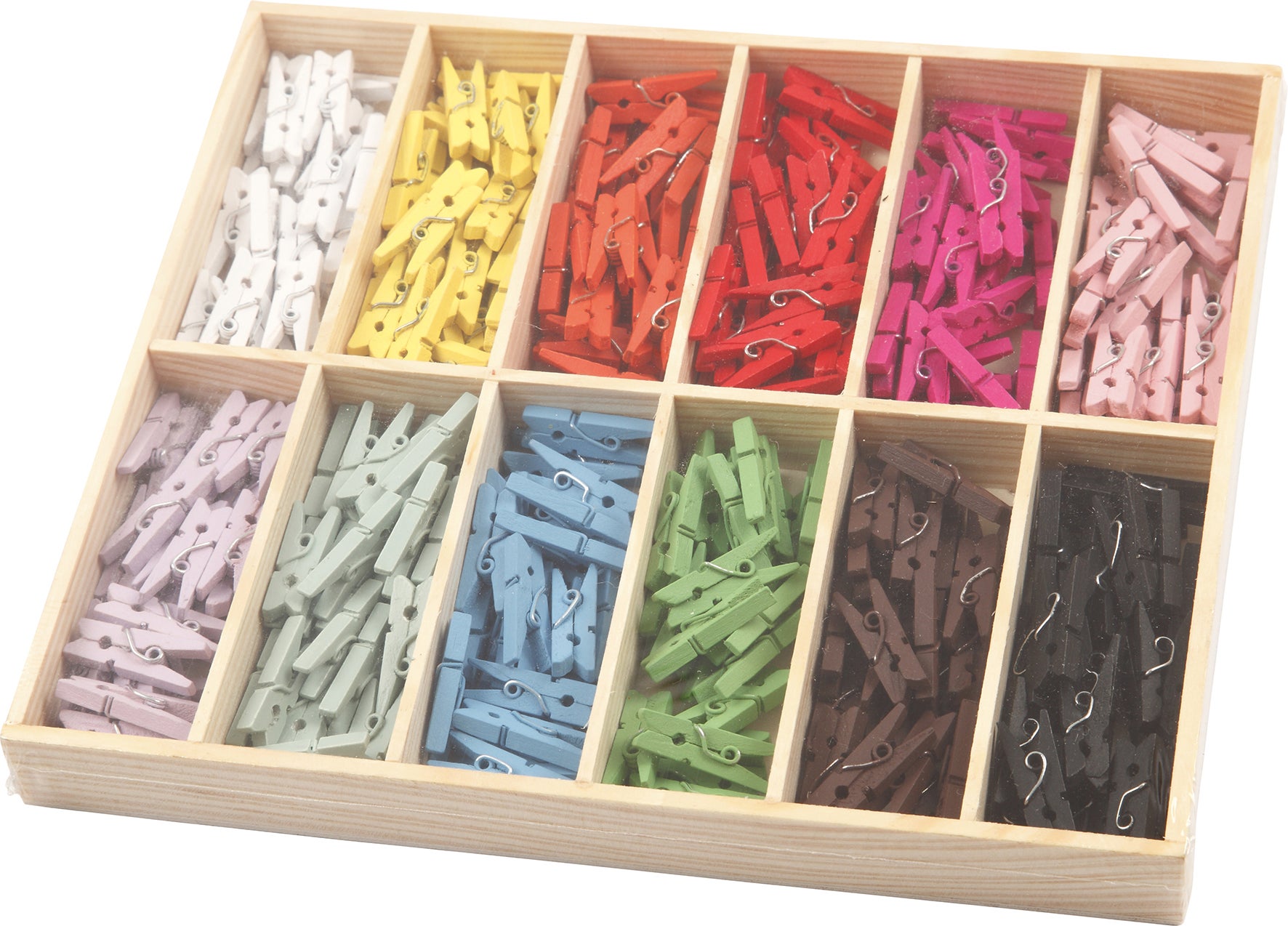 Mini klädnypor i målat trä i 12 olika färger i praktisk trälåda.