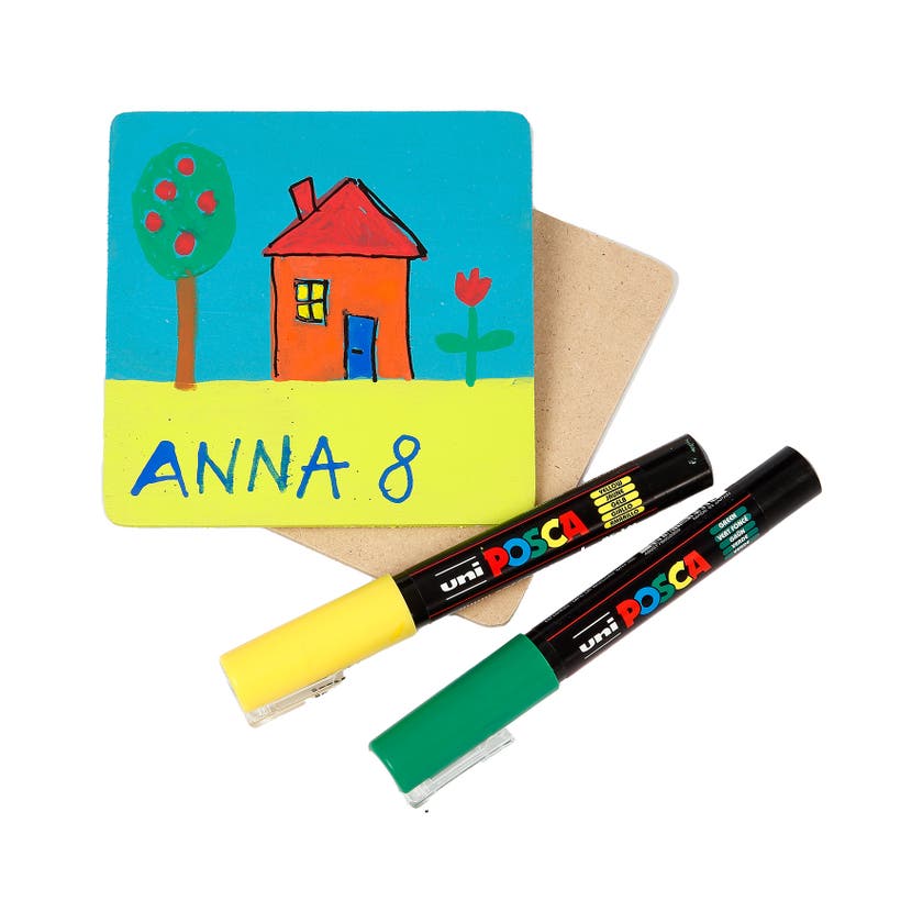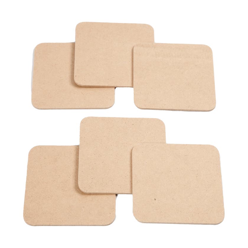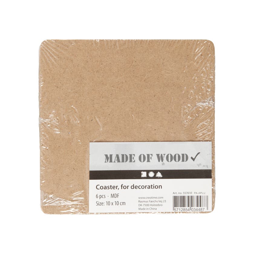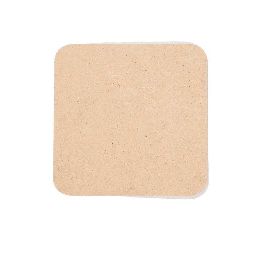 Platta i MDF. Kvadratiska, tunna plattor med avrundade hörn. Kan dekoreras med flera olika tekniker och användas som underlägg, tavlor m.m.