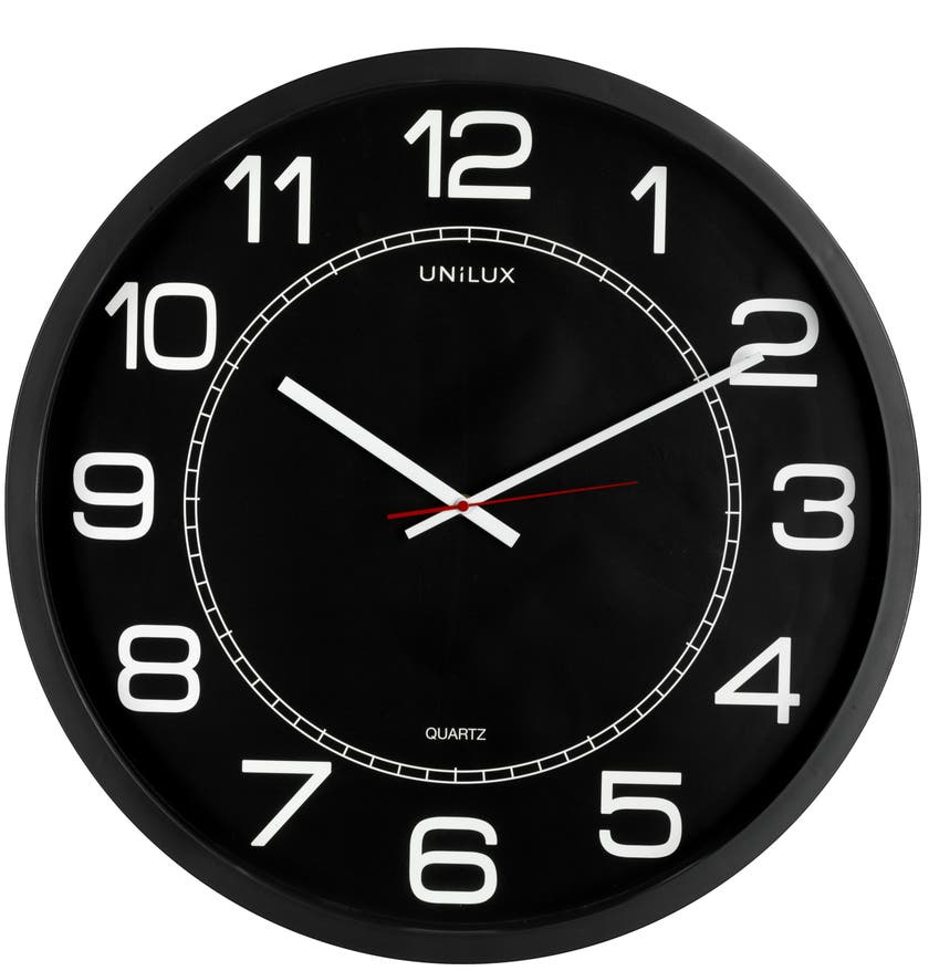 Väggklocka Mega 575 mm. Unilux MEGA är en stor klocka på 575 mm i diameter. Glasfront som skyddar mot damm och smuts. Läsbar från 180 meter tack vare de stora vita siffrorna.