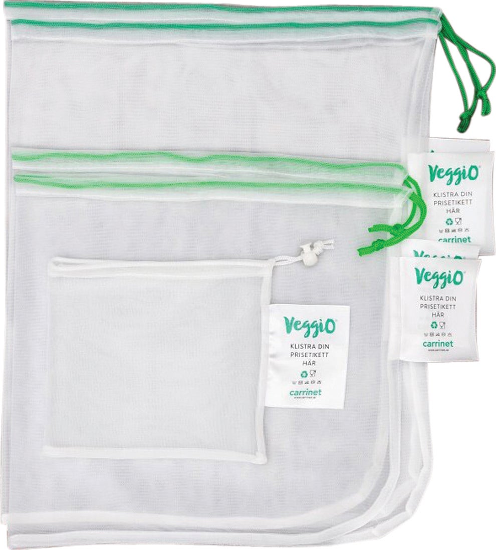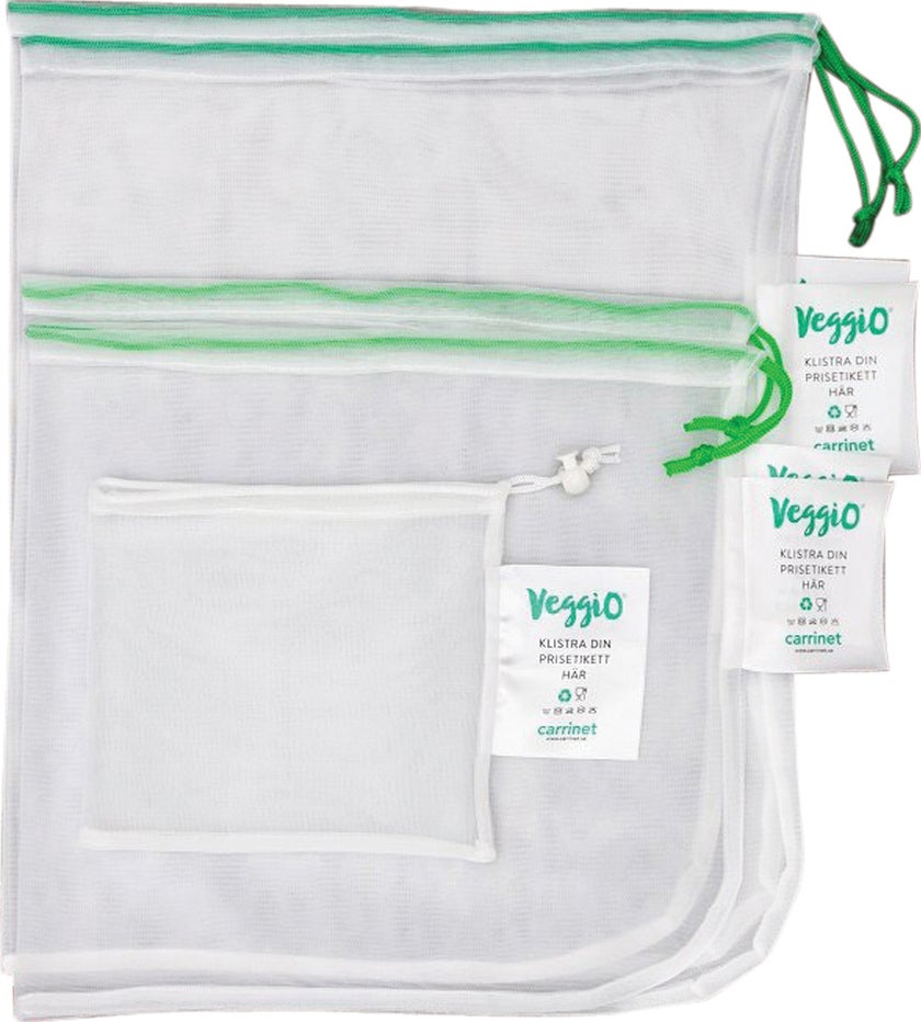 Veggio Nätpåsar i set - Denna praktiska uppsättning med 5 nätpåsar är det perfekta startpaketet för alla som vill minska användningen av små engångspåsar! Den minsta påsen är försedd med en stopper vilket inte bara gör att påsen passar perfekt för ärtor eller lime men också som smart förvaring av de övriga 4 påsarna.