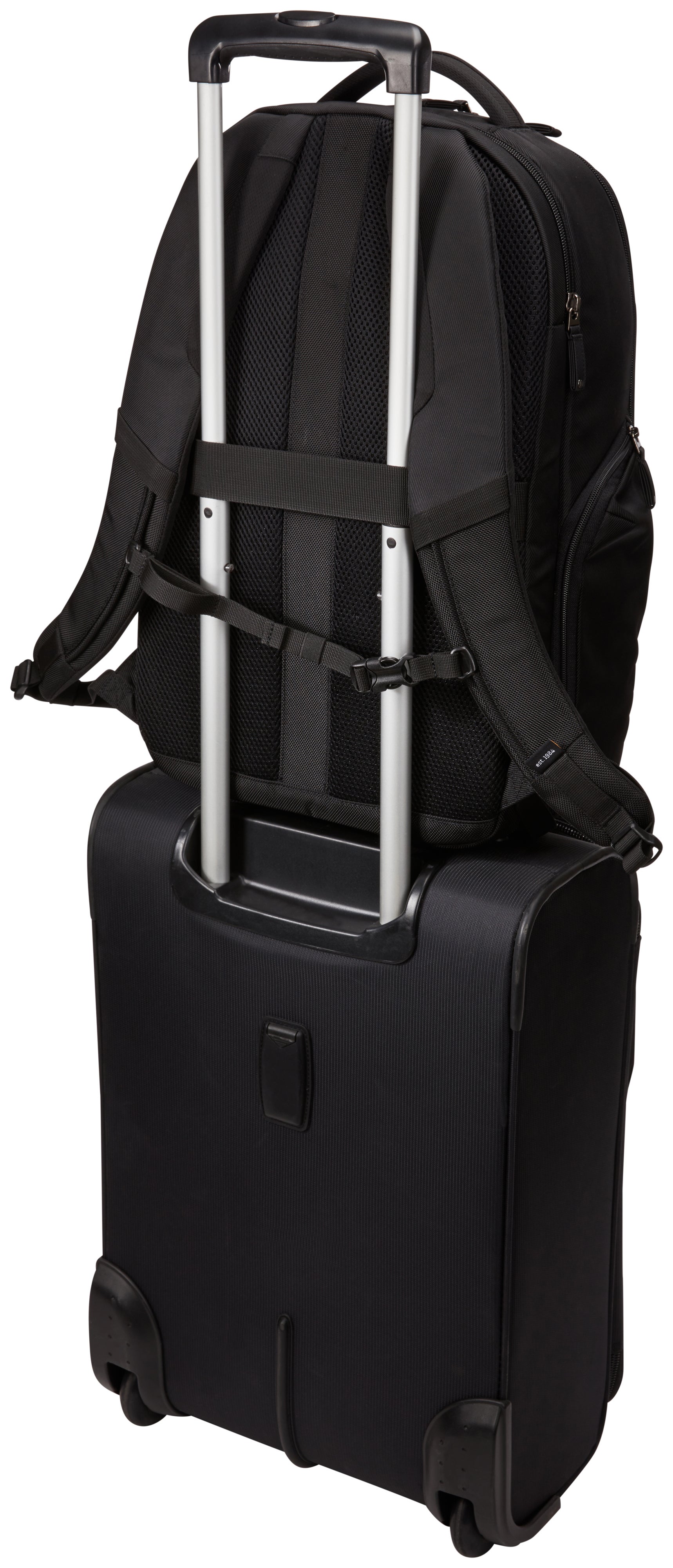 Tysta vikta PU-dragkedjor. Slitstark 1680 denier polyester, modernt twillaccentmaterial och PU-kant för en snygg väska. Fäst på rullväskan med remmen. Sidofickor med dragkedja kan expandera för att rymma en vattenflaska eller ge säker förvaring. Justerbar bröstbensrem stabiliserar vikten vid större belastningar.
