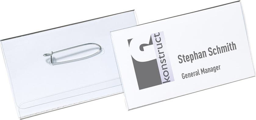 Namnskylt med nål i transparent plast, med neutrala utbytbara insticksetiketter.