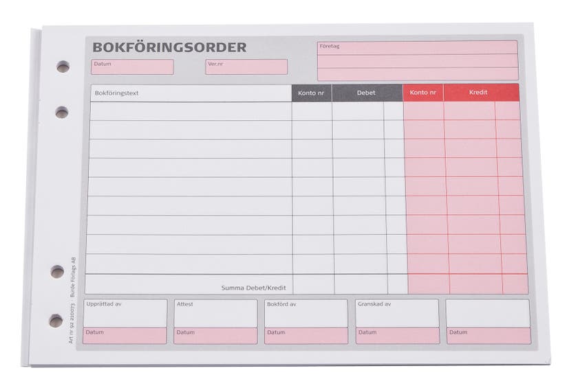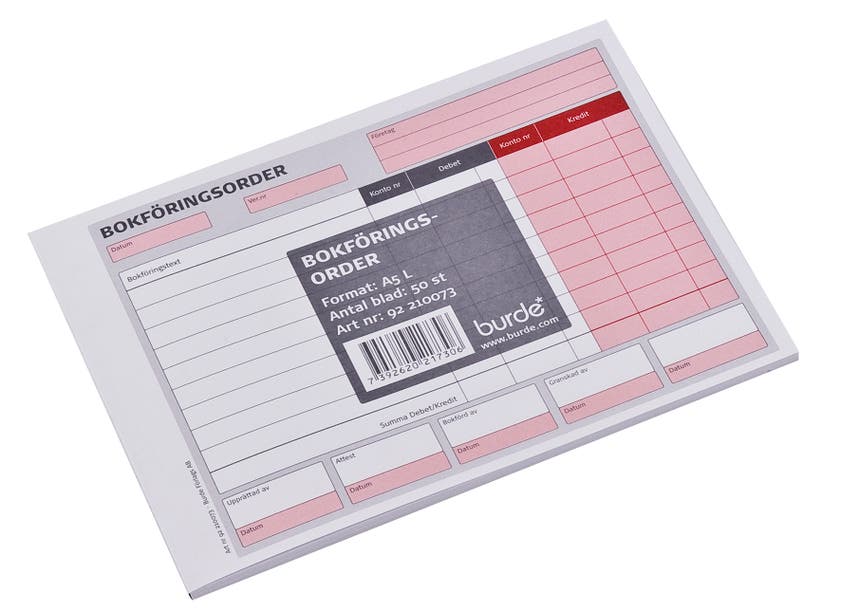 Bokföringsorder i block utan kopia, kredit i rött.