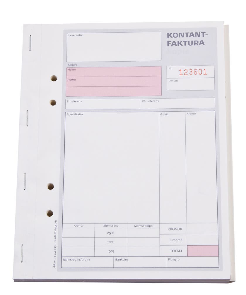 Kontantfakturablock med 2 kopior.