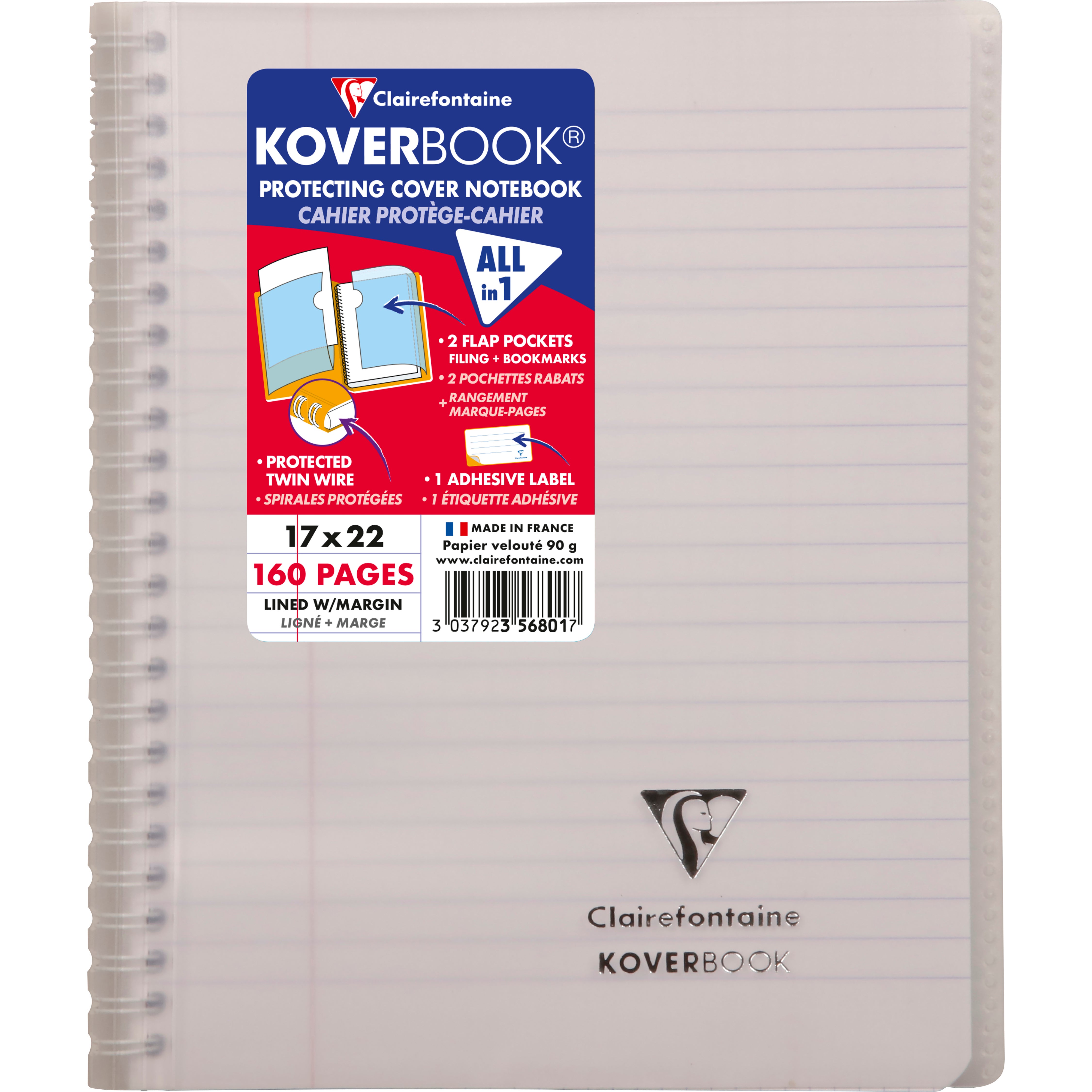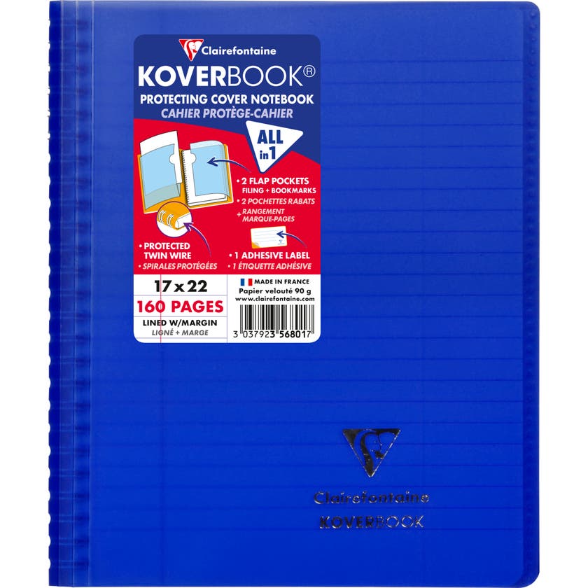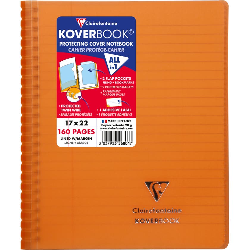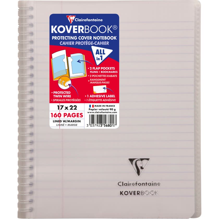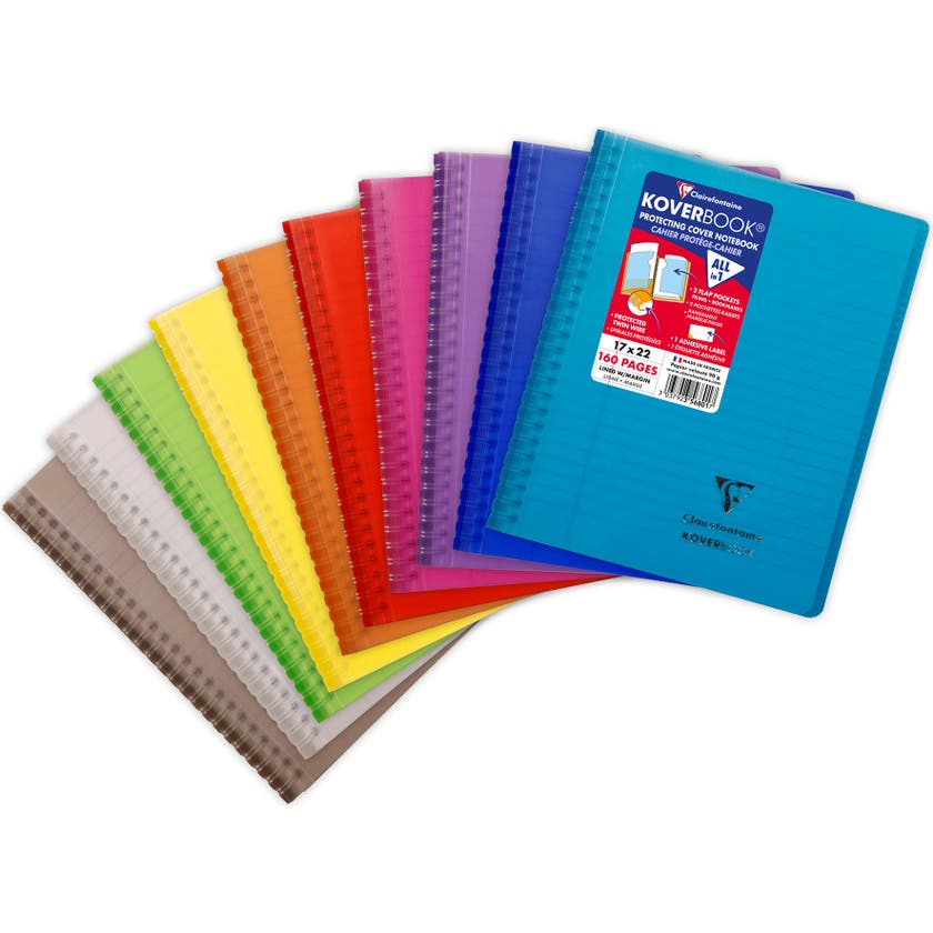 Kollegieblock Koverbook. Skrivblock med transparent ultraresistent pp-plast omslag med två fickor med plats för förvaring av lösa lappar. Ett klassisk anteckningsblock med spiral i vänster sida och omslag baktill.