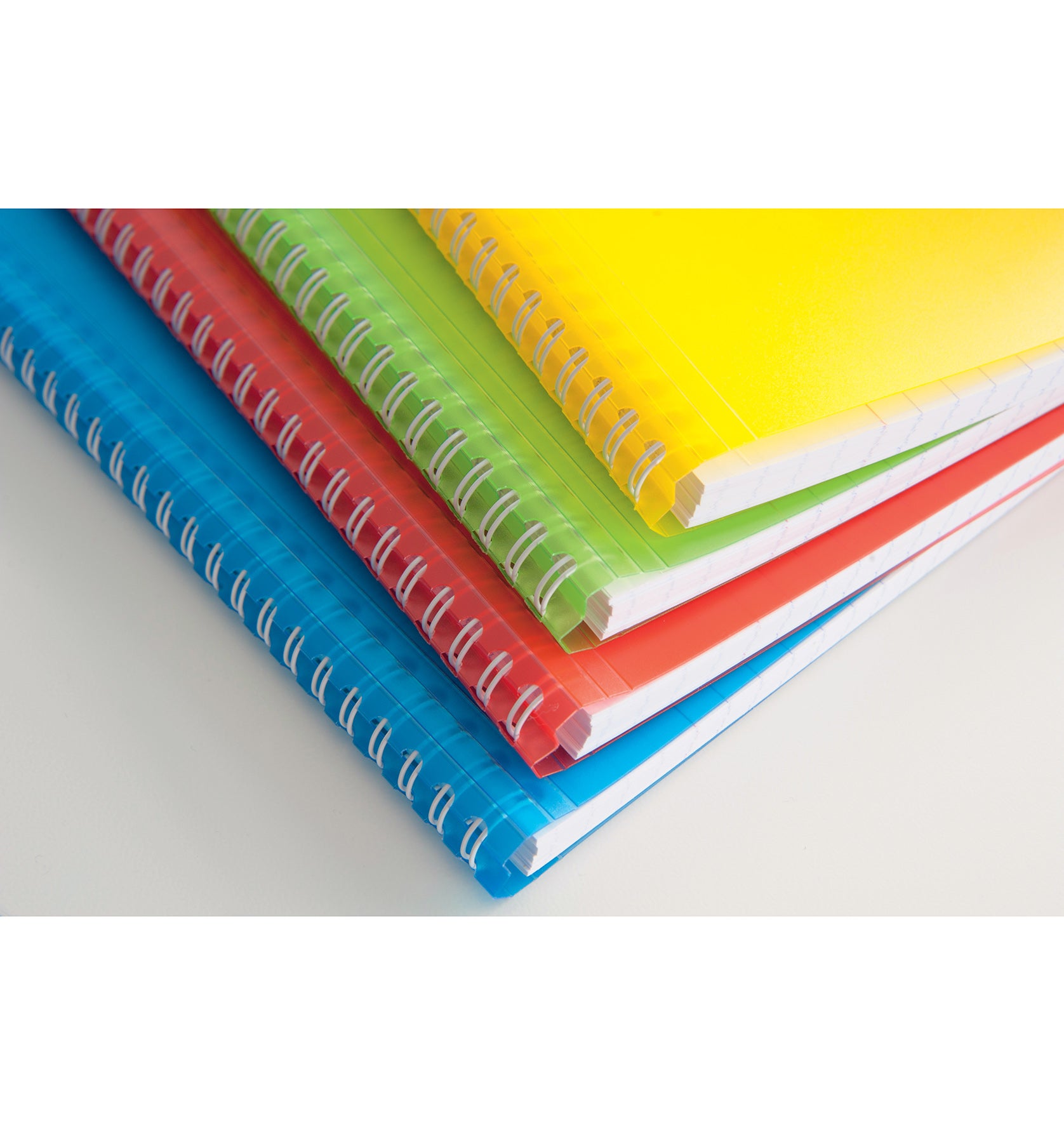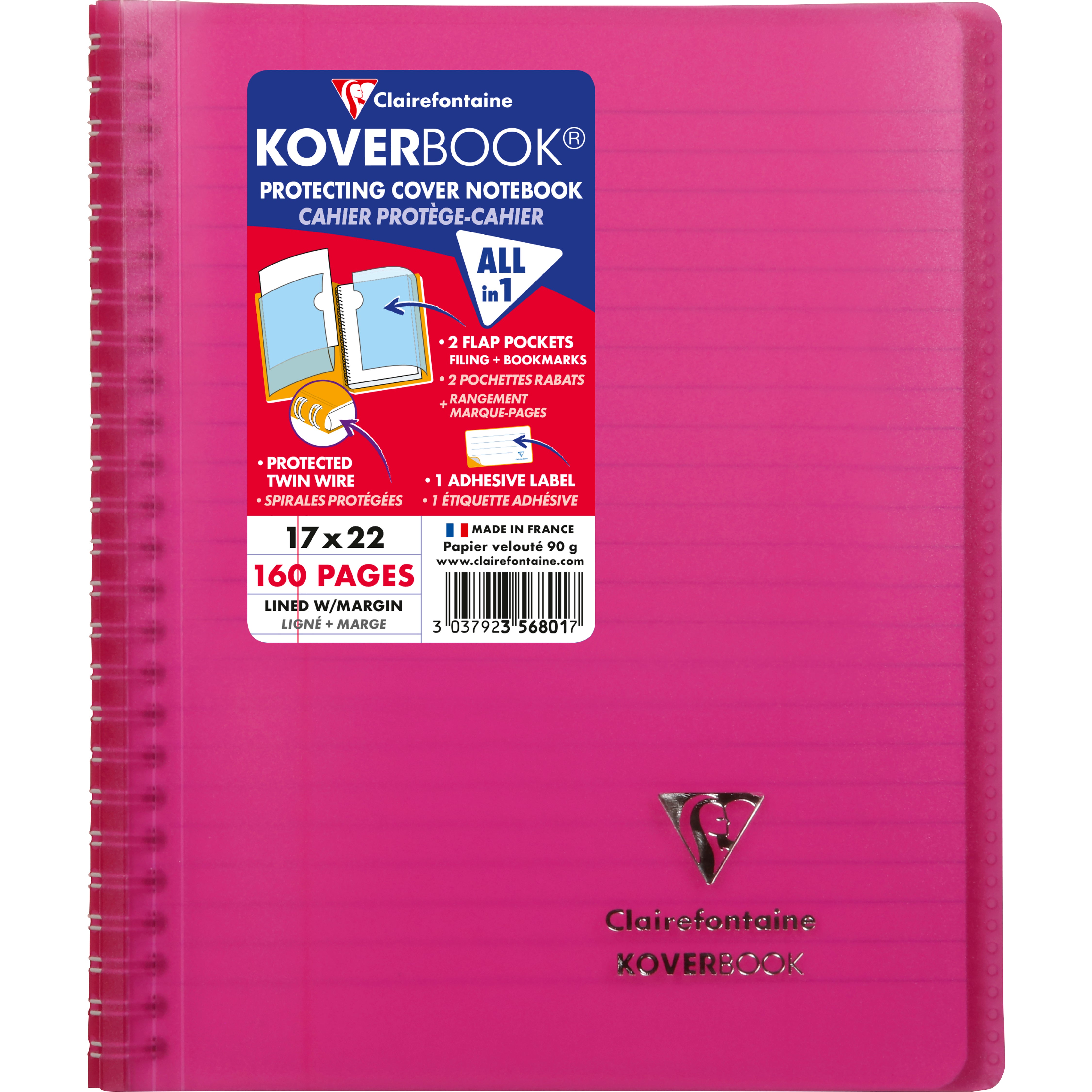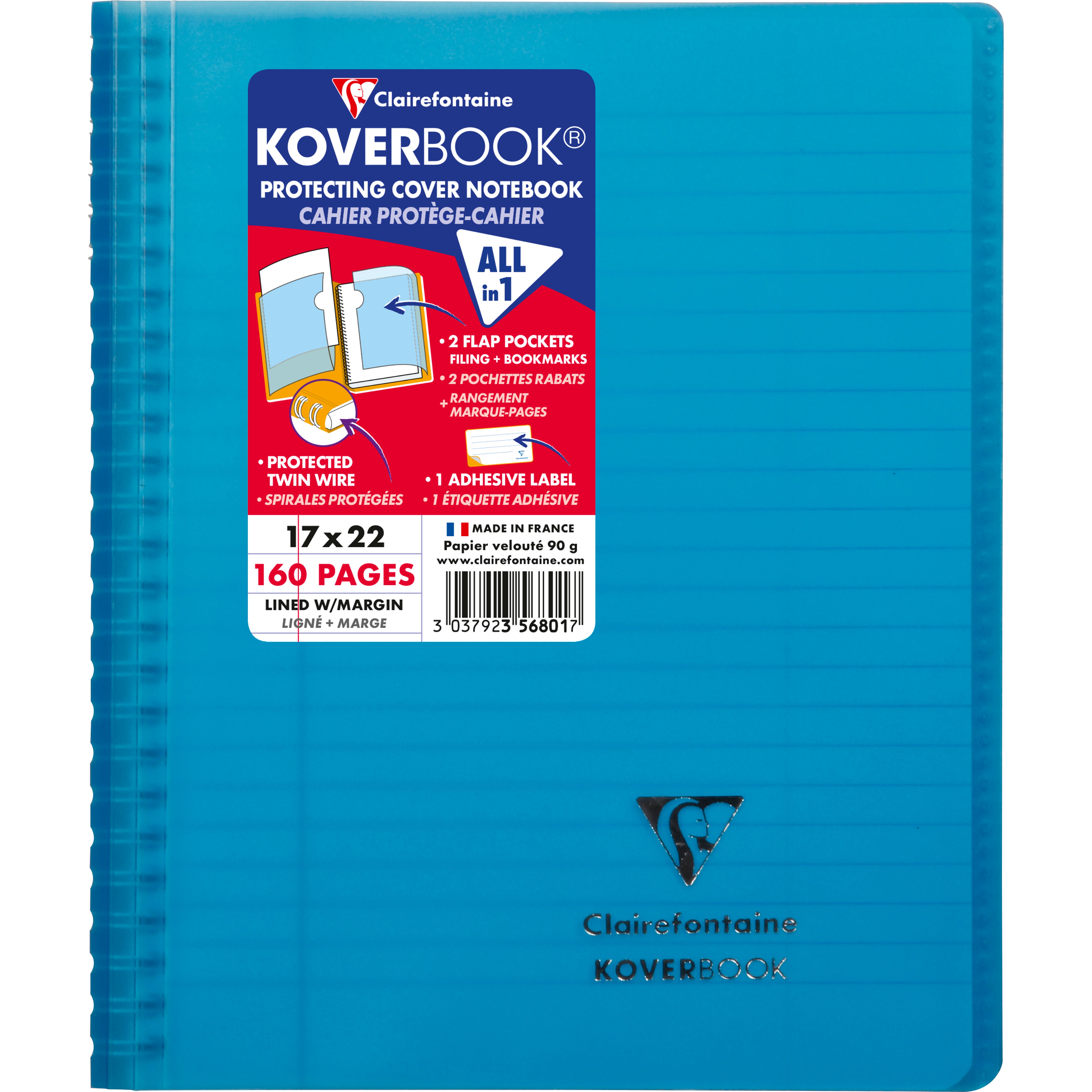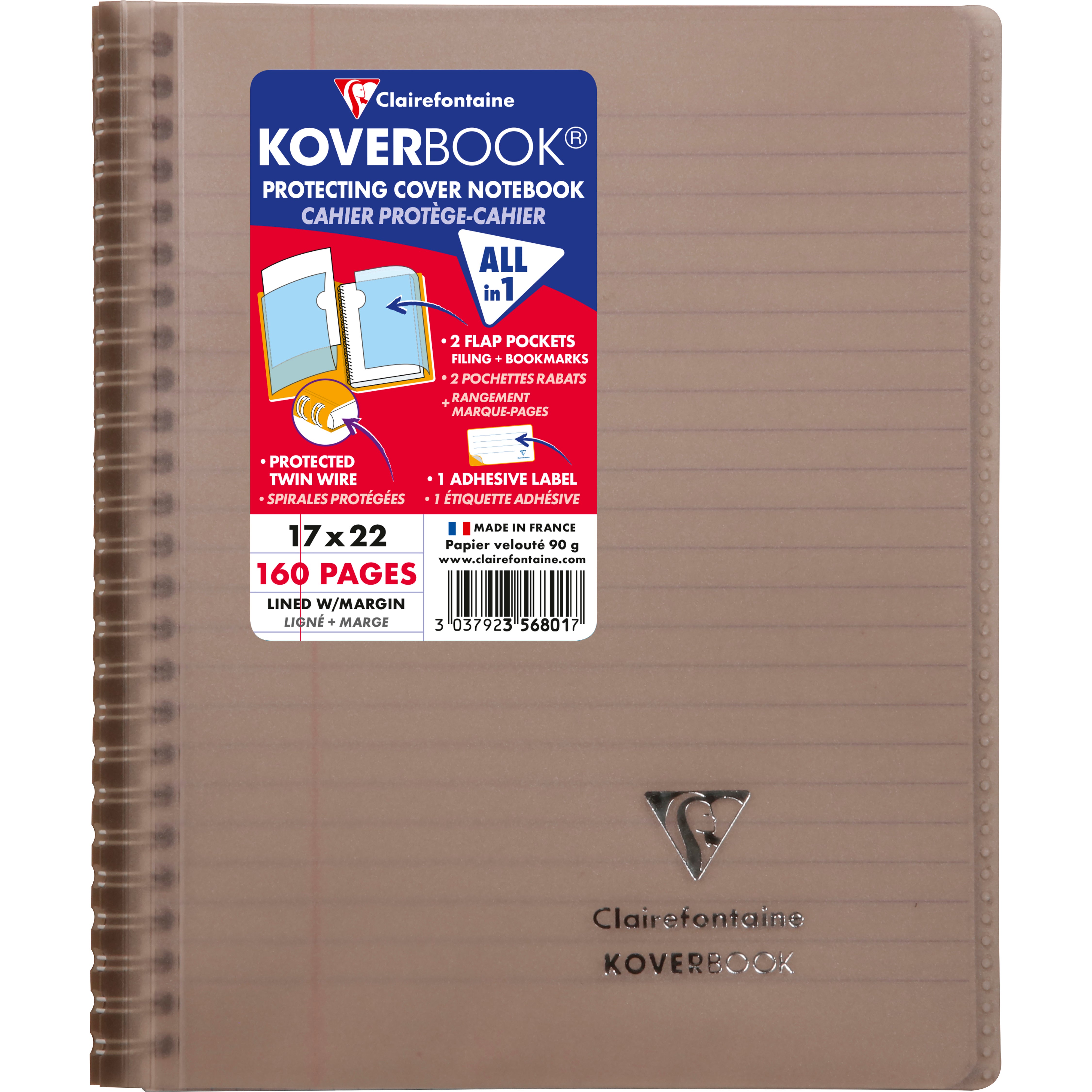 Kollegieblock Koverbook. Skrivblock med transparent ultraresistent pp-plast omslag med två fickor med plats för förvaring av lösa lappar. Ett klassisk anteckningsblock med spiral i vänster sida och omslag baktill.