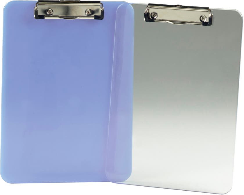 Med fjäderklämma med gummikanter som håller papperna på plats. Med upphängningshål.