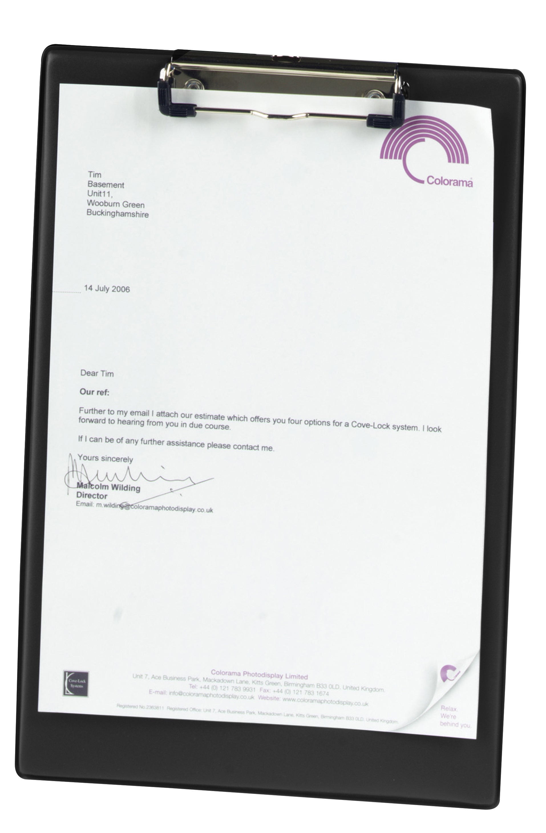 Office Depot styva skrivplatta som passar både som skrivunderlag och dokumenthållare. Tillverkad i PVC-plast och med fjäderklämma med gummikanter som håller papperna på plats, vilket gör att det är lätt att ha med dig och nära till hands medans du är på språng. Enkelt att samla ihop de dokument som behövs för dagen för ordertagning, kontroll, sammanställa formulär samt underteckna papper. Passar även för olika scheman och menyer. * Finns i flera färger * Med upphängningshål * 340 x 235 mm för A4 * Metallklämma som håller papperna på plats * Inkl pennhållare * Klarar av ca 50 blad