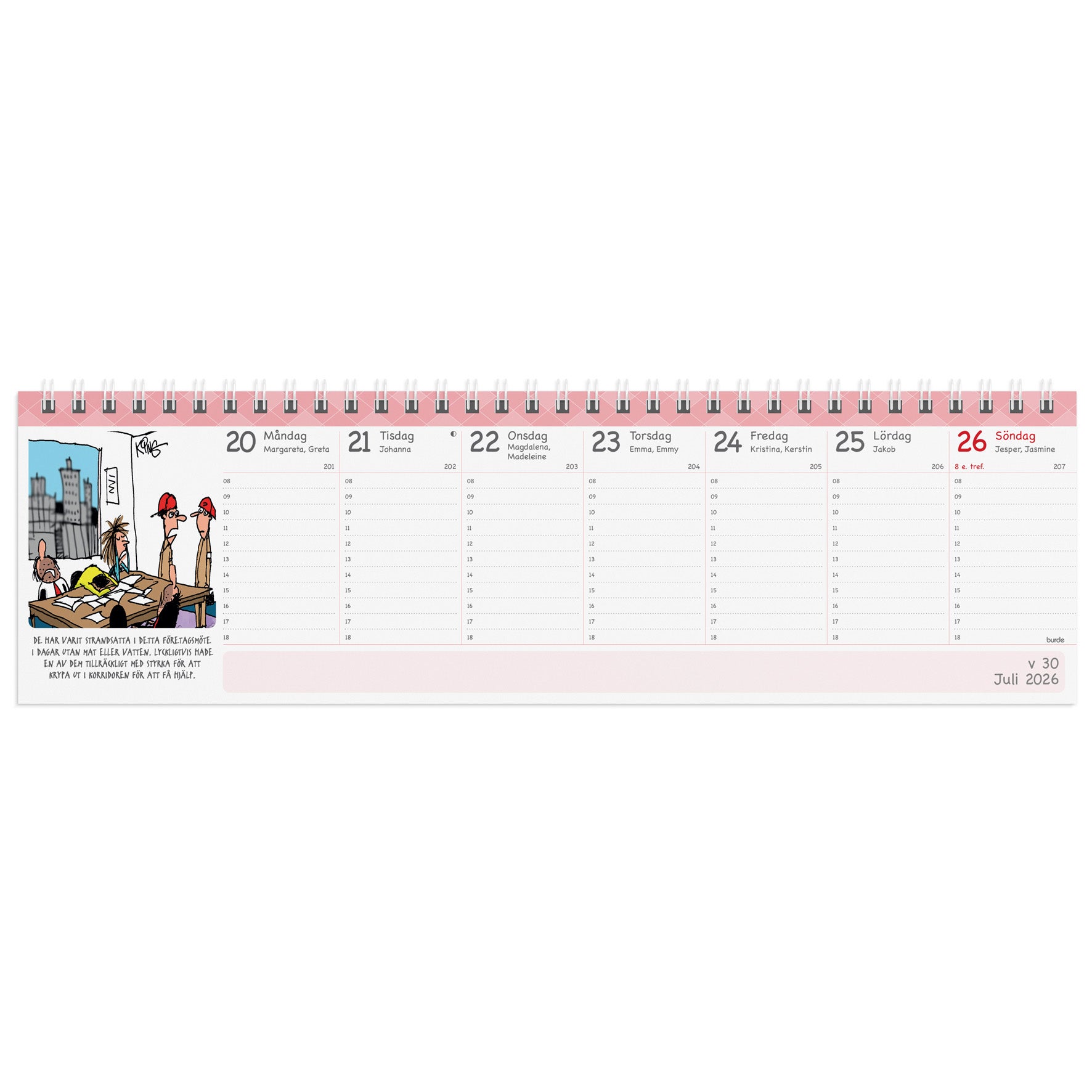 Veckoalmanackan Humor från Burde, spiralbunden och med omslag i kartong.