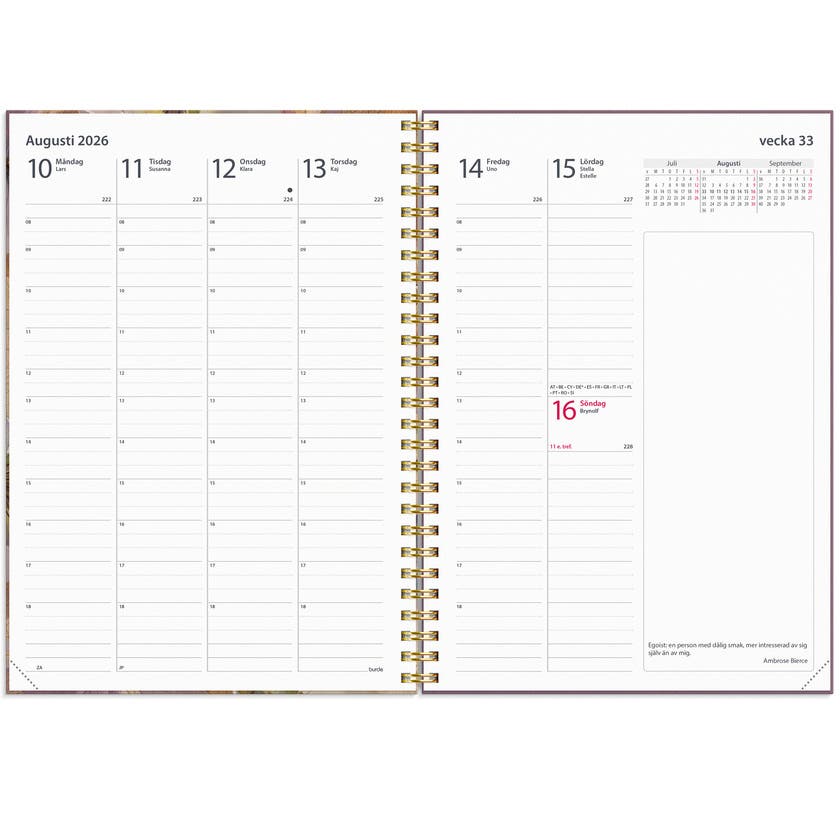 Kalendern har ett naturinspirerat motiv med detaljer i guldfolie som gör det lilla extra. Att ha flyt på jobbet handlar till stor del om konsten att planera Det här är kalendern för dig som vet att arbetsdagen lätt blir hektisk och snabbt fylls på med möten och uppgifter, och vill ha bra översikt över din veckoplanering. När du vet vad som väntar varje dag blir du mer effektiv och chansen är större att du når dina mål.