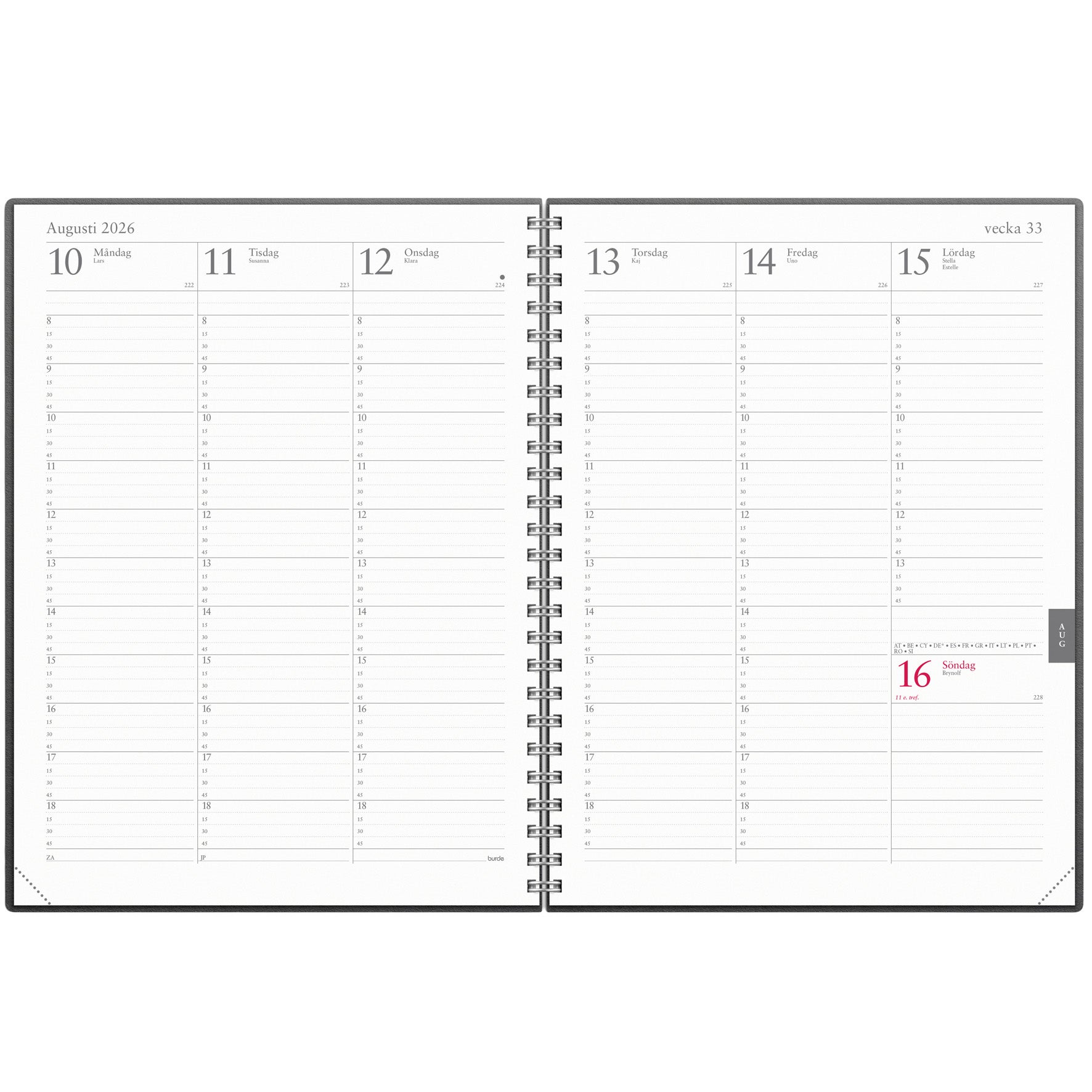 - Layout: Stående. Vecka/uppslag. Kvartsindelning 8–19.