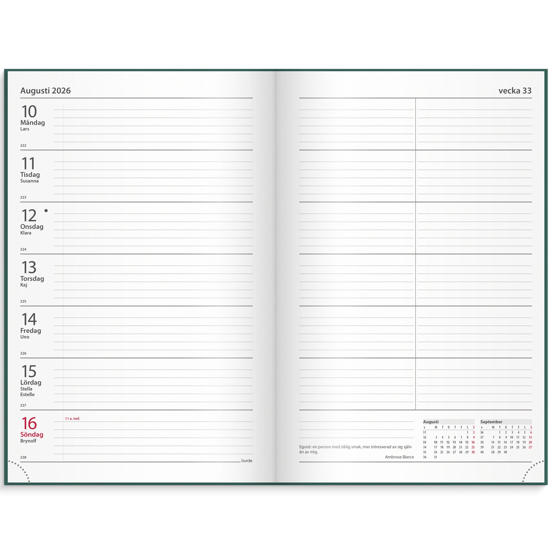 Kontorskalender 2026 från Burde, inbunden och omslag i kartong.