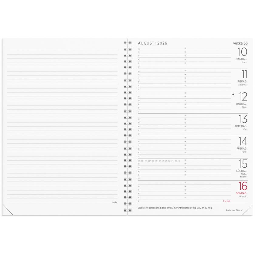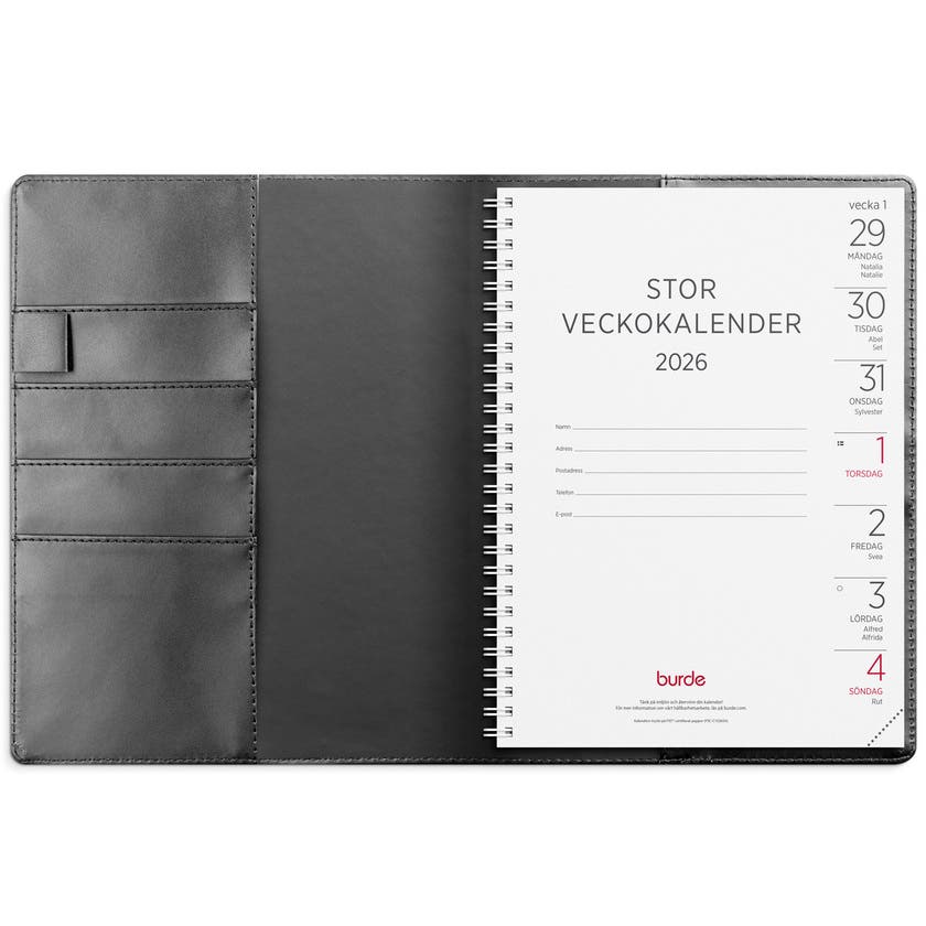 Kalender 2026 från Burde. Format: A5. Layout: Liggande. Vecka/uppslag. Timindelning 8-17. Kalendarium: 2025-12-22 - 2027-01-03. Omslag: Konstläder. Spiralbunden. Innehåll: Kyrkliga helgdagar, Flaggdagar, Helgdagar/aftnar, Internationella helgdagar, Linjerade vänstersidor, Månfaser, Namnsdagar, Internationella helgdagar översikt, Löst telefonblad, Temadagar/händelser, Årsöversikt/årsöversikter, Årsplan/årsplaner. Antal sidor: 112. Miljöinformation: FSC® papper.