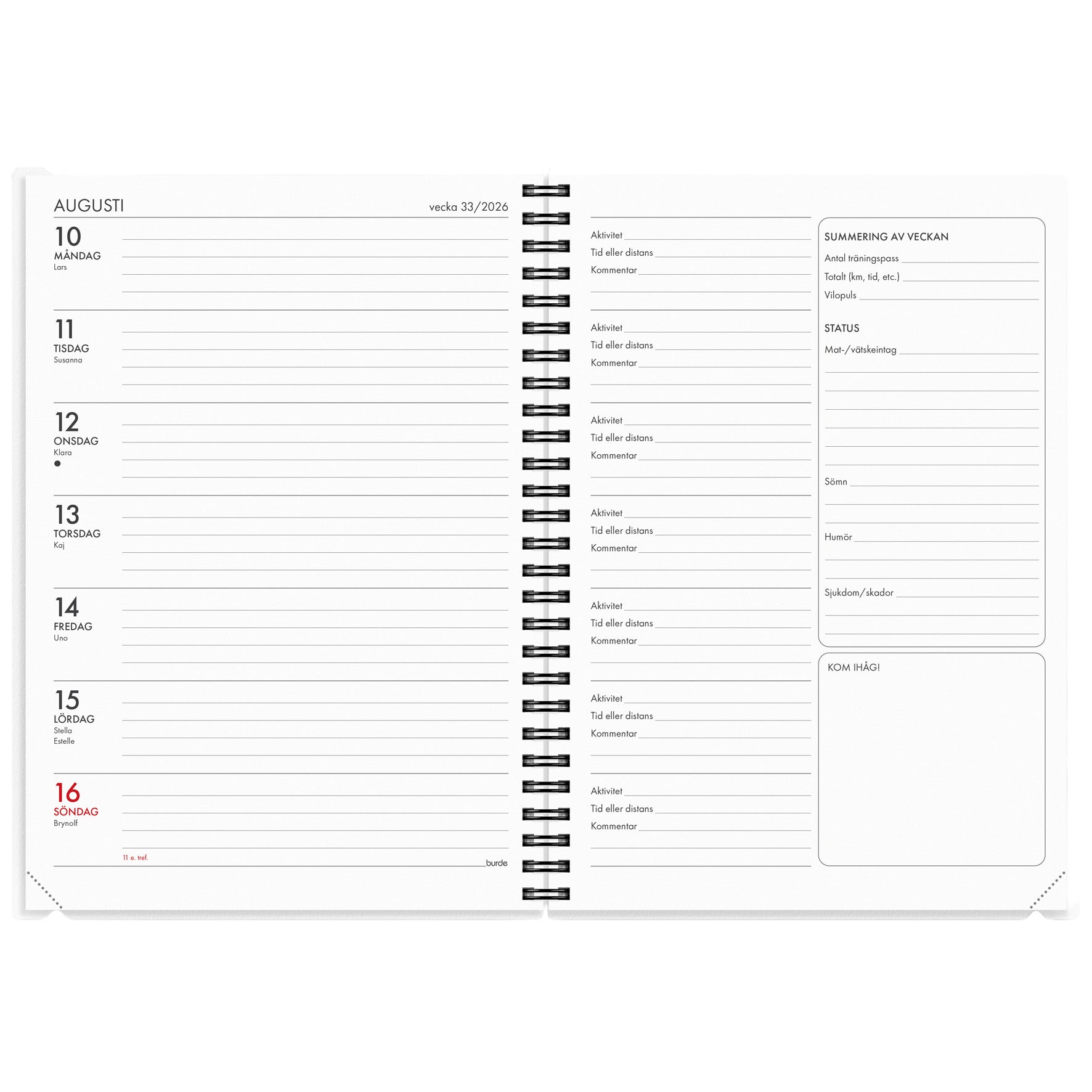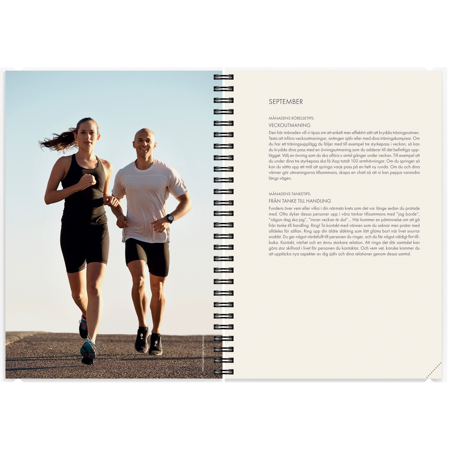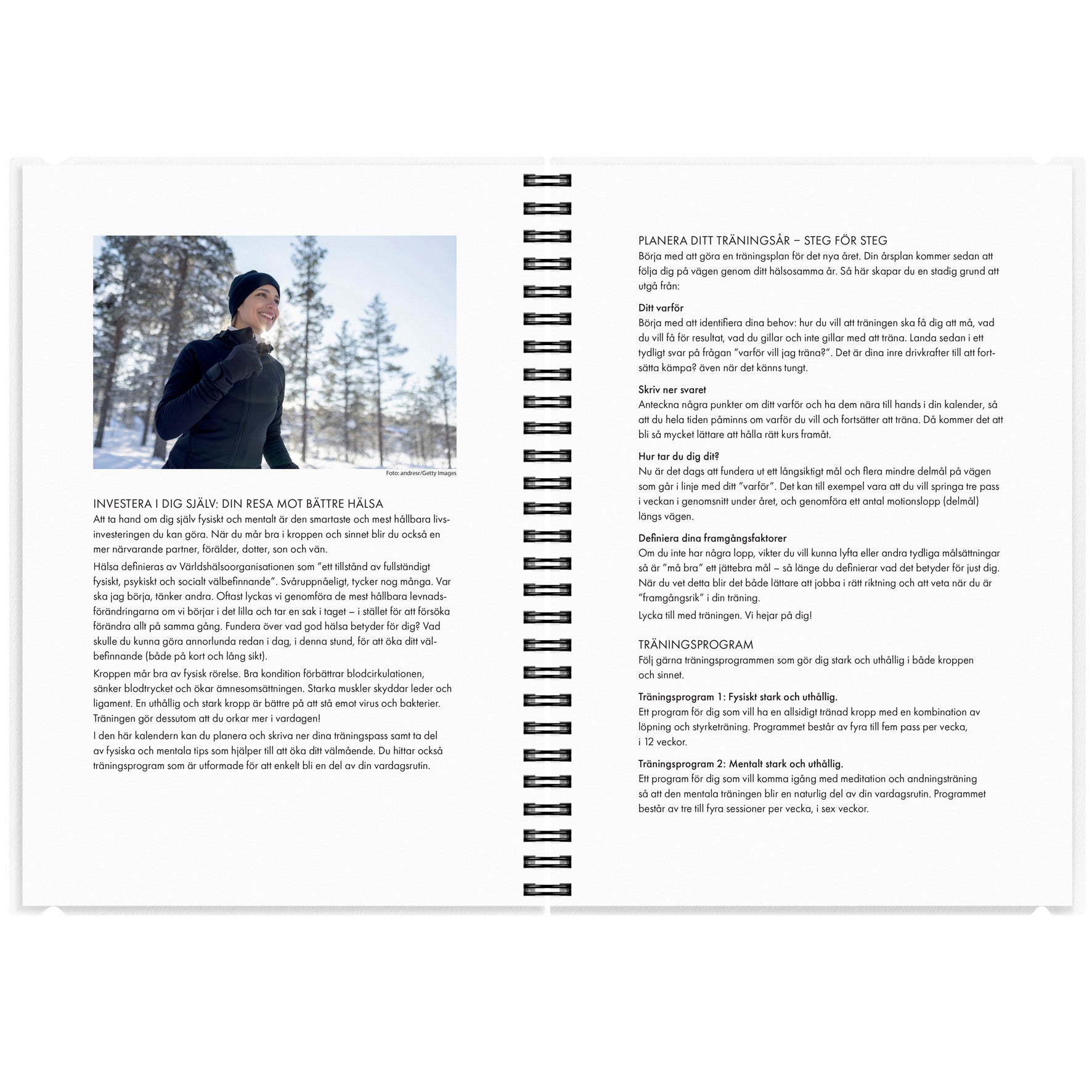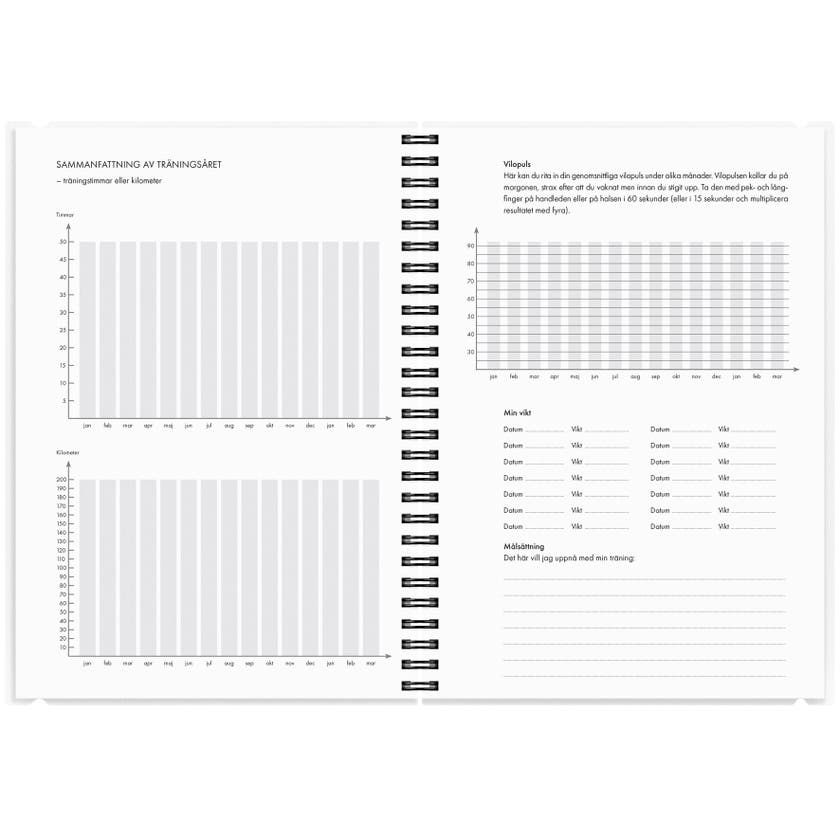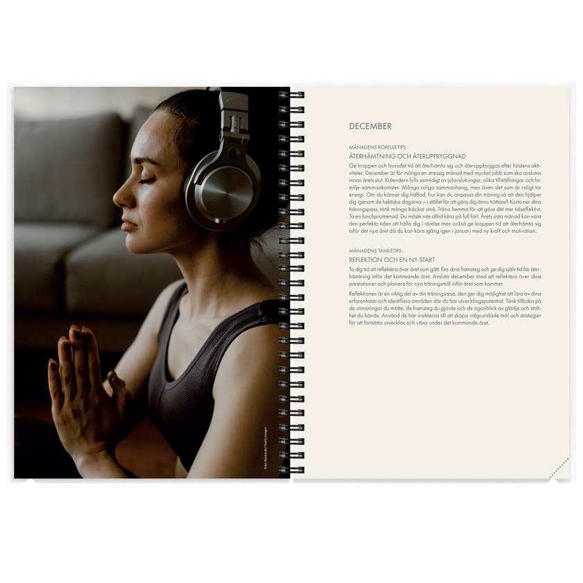 Träningskalendern från Burde hjälper dig med sunda vanor i din vardag, men även att behålla dem över tid. Kalendern passar dig som vill ha allsidig träning med en kombination av löpning och styrketräning. Det ingår även ett program för dig som vill komma i gång med meditation och andningsövningar så att den mentala träningen också blir en naturlig del av din vardag. Båda programmen är signerade löpcoachen och PT:n Jenny Sunding. Jenny ger också hälsosamma tips som håller inspirationen vid liv hela året. På varje uppslag finns dels en kalendersida med veckoplanering och dels en aktivitetssida. Kalendern har ett funktionellt plastomslag för att kunna följa med dig på träningspassen och även två olika framsidor att växla mellan.