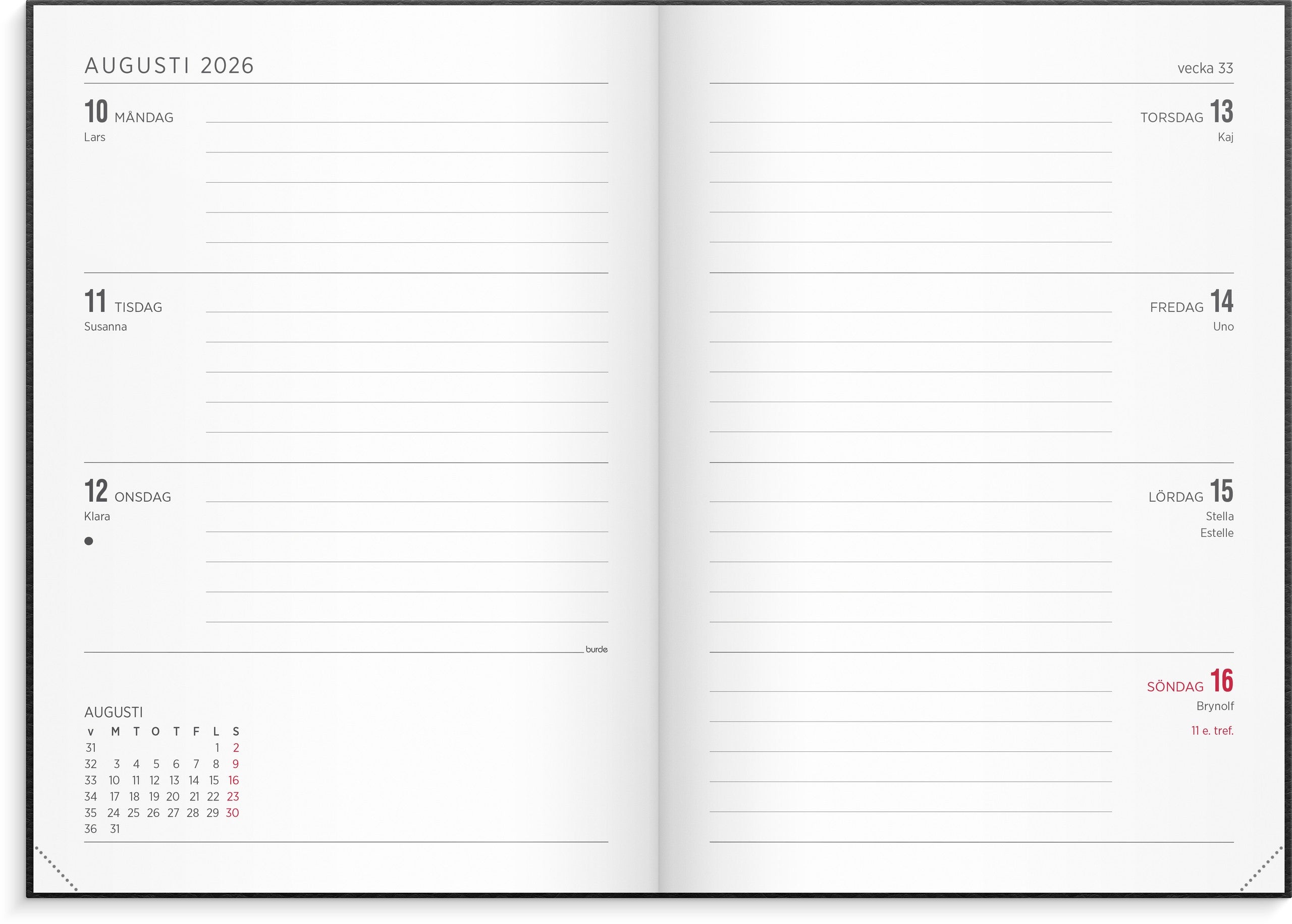Senator A5 har ett klassiskt veckouppslag med liggande layout. Fokus ligger på en enkel veckoplanering. Med årsöversikt och årsplanering blir senator A5 ett perfekt verktyg för dig som har mycket på gång eller som ett analogt komplement till dina tekniska lösningar. Check-listor och mindre anteckningsmöjligheter ingår också liksom en praktisk förvaringsficka. Omslaget Vega i svart skinnimitation ger en klassisk look till en traditionell kalender.